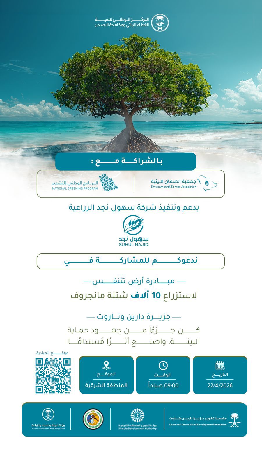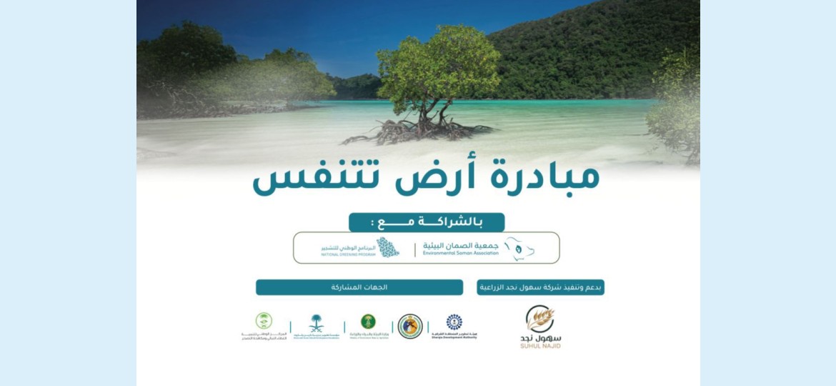ينظم المركز الوطني لتنمية الغطاء النباتي ومكافحة التصحر، بالشراكة مع جمعية الصمان البيئية، وضمن البرنامج الوطني للتشجير، مبادرة بيئية بعنوان “أرض تتنفس”، وذلك يوم الأربعاء الموافق 22 أبريل 2026م، في جزيرة دارين وتاروت بالمنطقة الشرقية، عند الساعة 09:00 صباحًا.