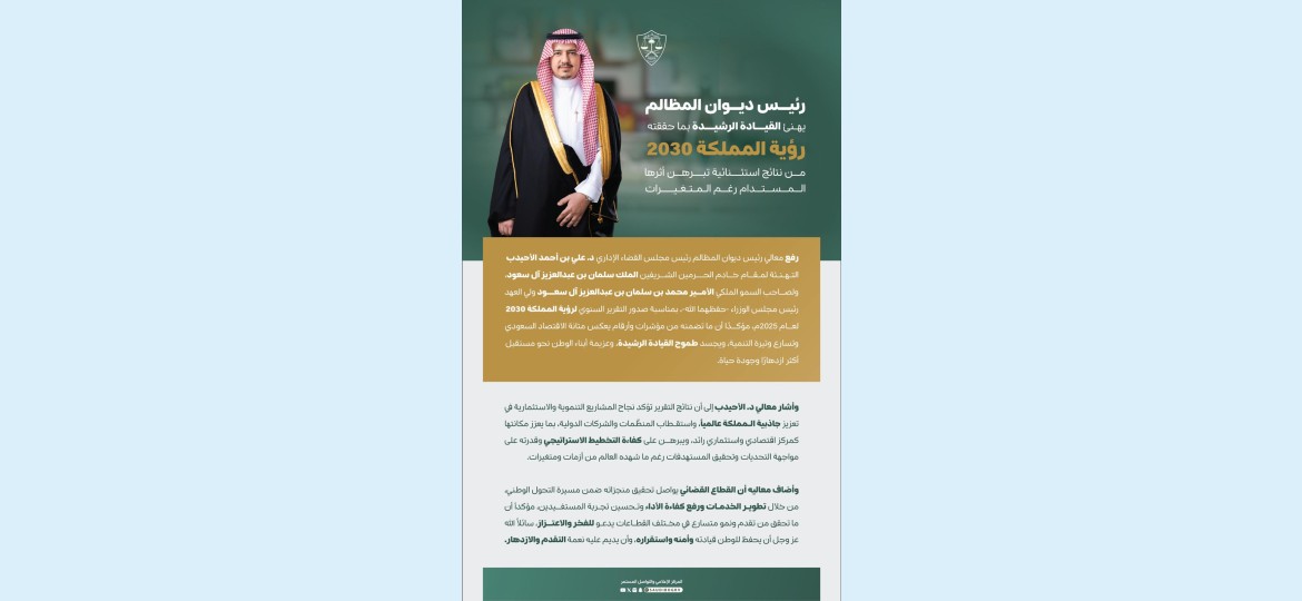 رفع معالي رئيس ديوان المظالم رئيس مجلس القضاء الإداري د. علي بن أحمد الأحيدب التهنئة لمقام خادم الحرمين الشريفين الملك سلمان بن عبدالعزيز آل سعود، ولصاحب السمو الملكي الأمير محمد بن سلمان بن عبدالعزيز آل سعود ولي العهد رئيس مجلس الوزراء -حفظهما الله-، بمناسبة صدور التقرير السنوي لرؤية المملكة 2030 لعام 2025م، مؤكدًا أن ما تضمنه من مؤشرات وأرقام يعكس متانة الاقتصاد السعودي وتسارع وتيرة التنمية، ويجسد طموح القيادة الرشيدة، وعزيمة أبناء الوطن نحو مستقبل أكثر ازدهارًا وجودة حياة.