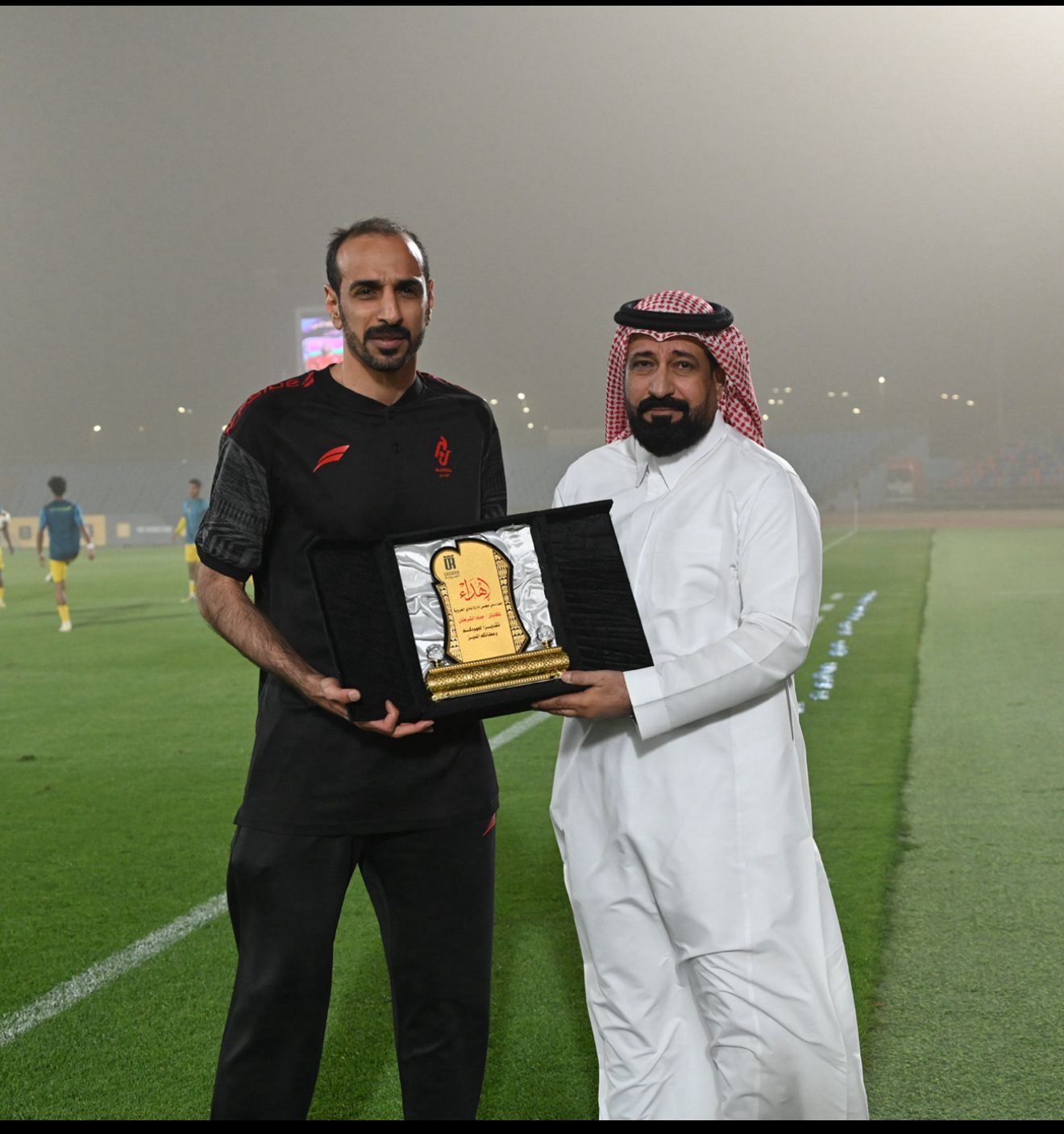 وتزينت ساعة ملعب المباراة بصورة اللاعب حماد الشرطان، مرفقة بشعارات الأندية الثلاثة وعبارة “القائد الثلاثي”، في لفتة تعبيرية جسدت حجم التقدير والاعتزاز بمسيرته.