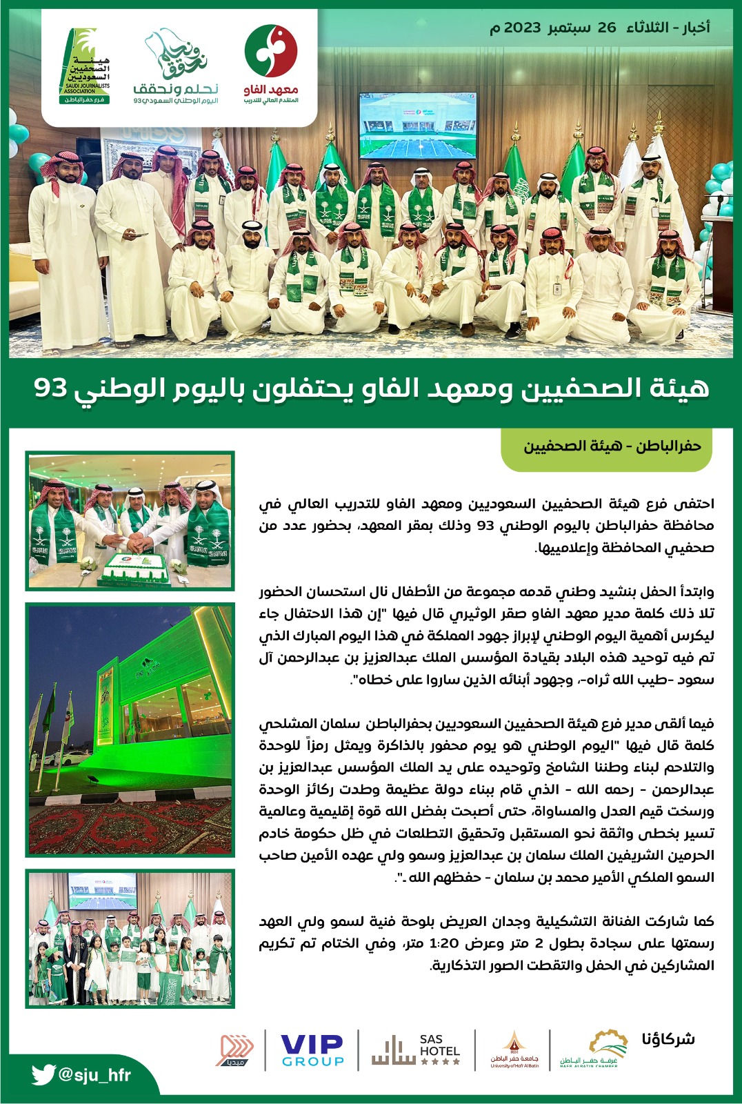 احتفى فرع هيئة الصحفيين السعوديين ومعهد الفاو للتدريب العالي في محافظة حفرالباطن باليوم الوطني 93 وذلك بمقر المعهد، بحضور عدد من صحفيي المحافظة وإعلامييها.