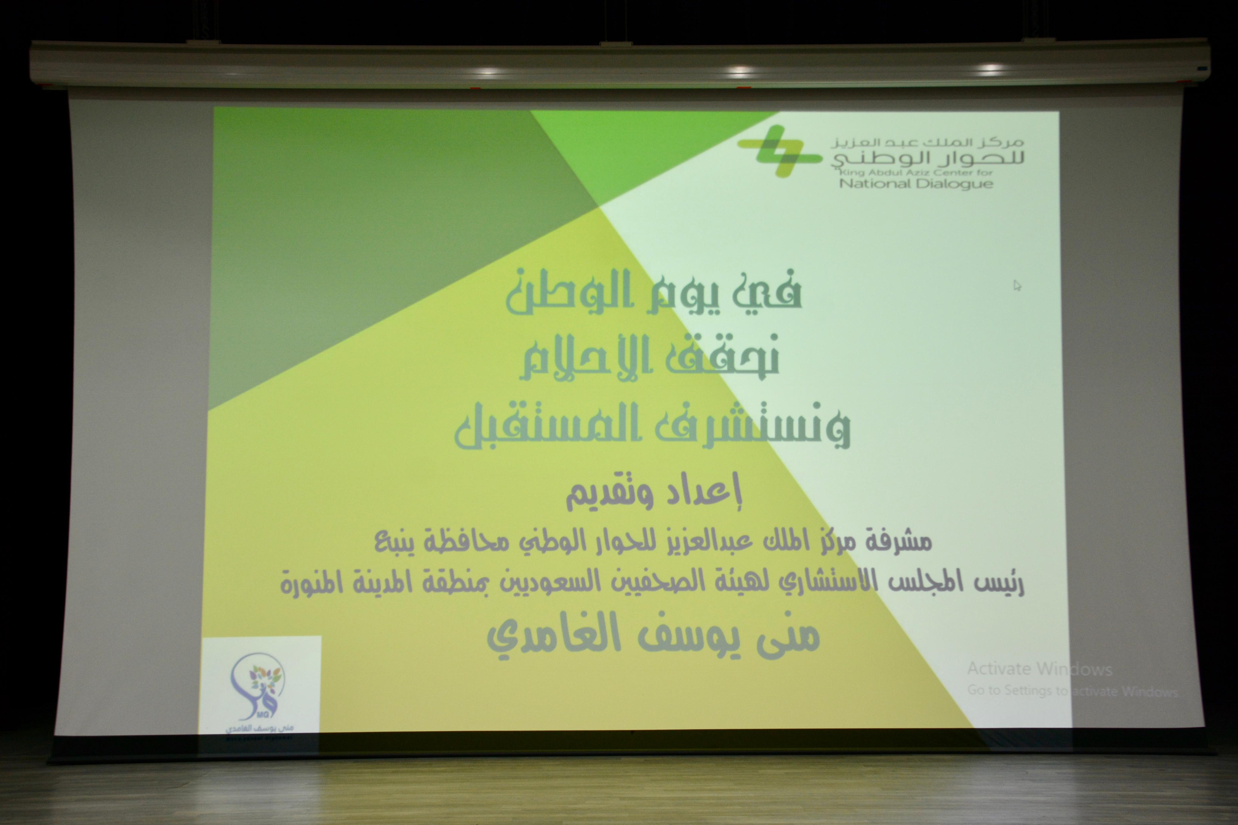 نفذ مركز الملك عبدالعزيز للحوار الوطني بمحافظة ينبع بالشراكة مع فرع هيئة الصحفيين السعوديين بالمدينة المنورة العديد من البرامج والفعاليات الوطنية ضِمن الاحتفاء باليوم الوطني الـ 93 للمملكة، تحت شعار "نحلم ونحقق"، الذي يصادف 23 سبتمبر من كل عام، وهي مناسبة وطنية تخليداً لذكرى توحيد المملكة وتأسيسها على يد المؤسس الملك عبدالعزيز - رحمه الله - .