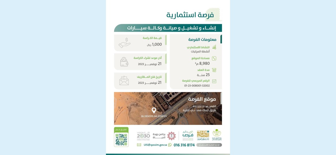 يأتي ذلك ضمن برامج أمانة منطقة القصيم الاستثمارية لتحقيق مستهدفات برنامج جودة الحياة، والتي تتيح من خلاله العديد من الفرص الاستثمارية يمكن الإطلاع عليها عبر تطبيق فرص القصيم.