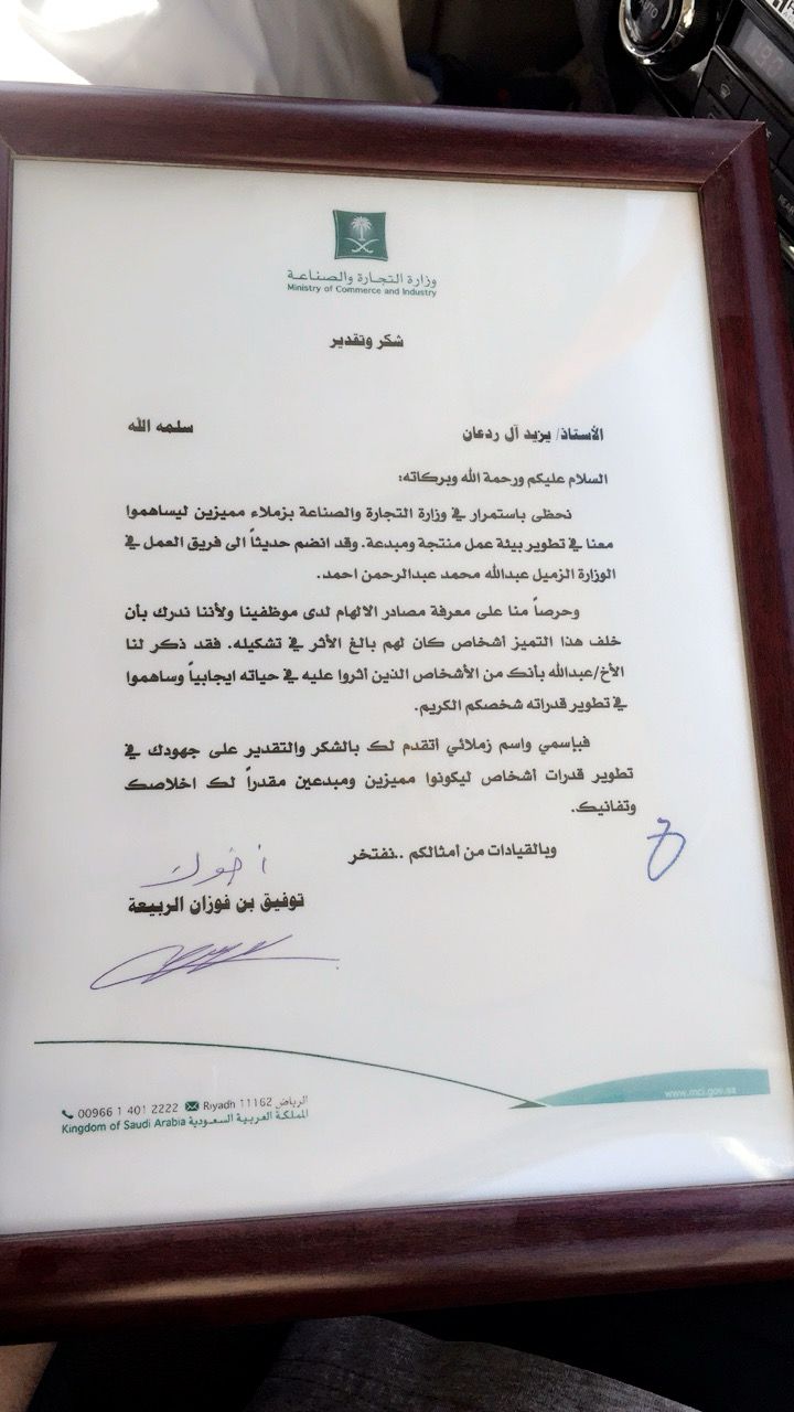 أخرج الشاب شهادة شكر وعرفان كتبها الوزير العظيم الإنسان د.توفيق الربيعة..
