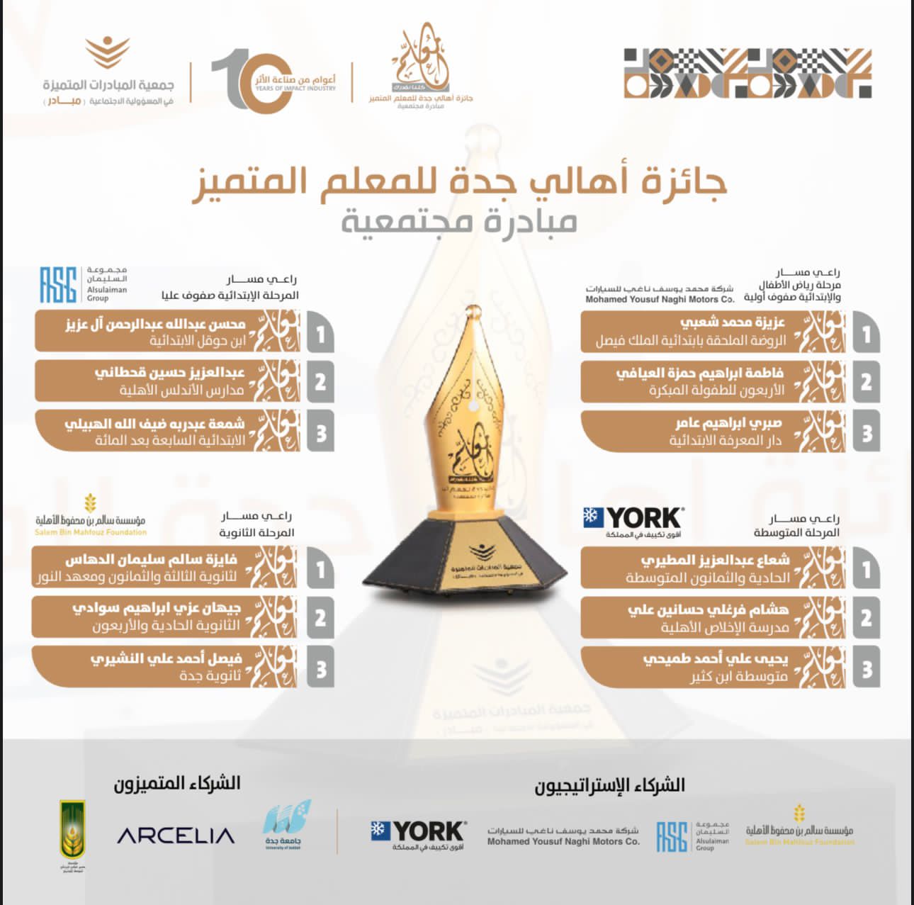 توّج وكيل إمارة منطقة مكة المكرمة الدكتور مشبب بن عايض القحطاني، 12 معلماً ومعلمة، الفائزين بجائزة أهالي جدة للمعلم المتميز في دورتها العاشرة،