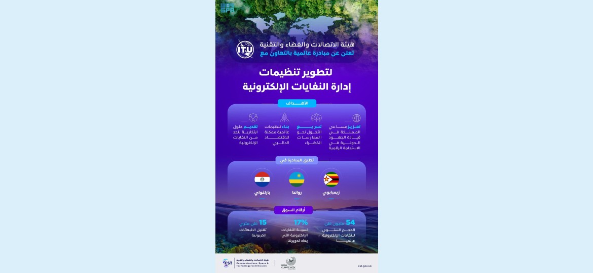 أعلنت هيئة الاتصالات والفضاء والتقنية مبادرة "تطوير تنظيمات إدارة النفايات الإلكترونية" بالتعاون مع الاتحاد الدولي للاتصالات، التي ستقود لتطبيق التنظيمات بشكل تجريبي في دول زيمبابوي ورواندا وباراغواي، وتسهم في وضع حجر الأساس لبناء تنظيمات ومعايير للحد من النفايات الإلكترونية عالمياً، حيث يصل حجمها إلى 54 مليون طن سنوياً، فيما يعاد تدوير 17% منها، مساهمة في خفض الانبعاثات الكربونية إلى 15 طناً مترياً.
