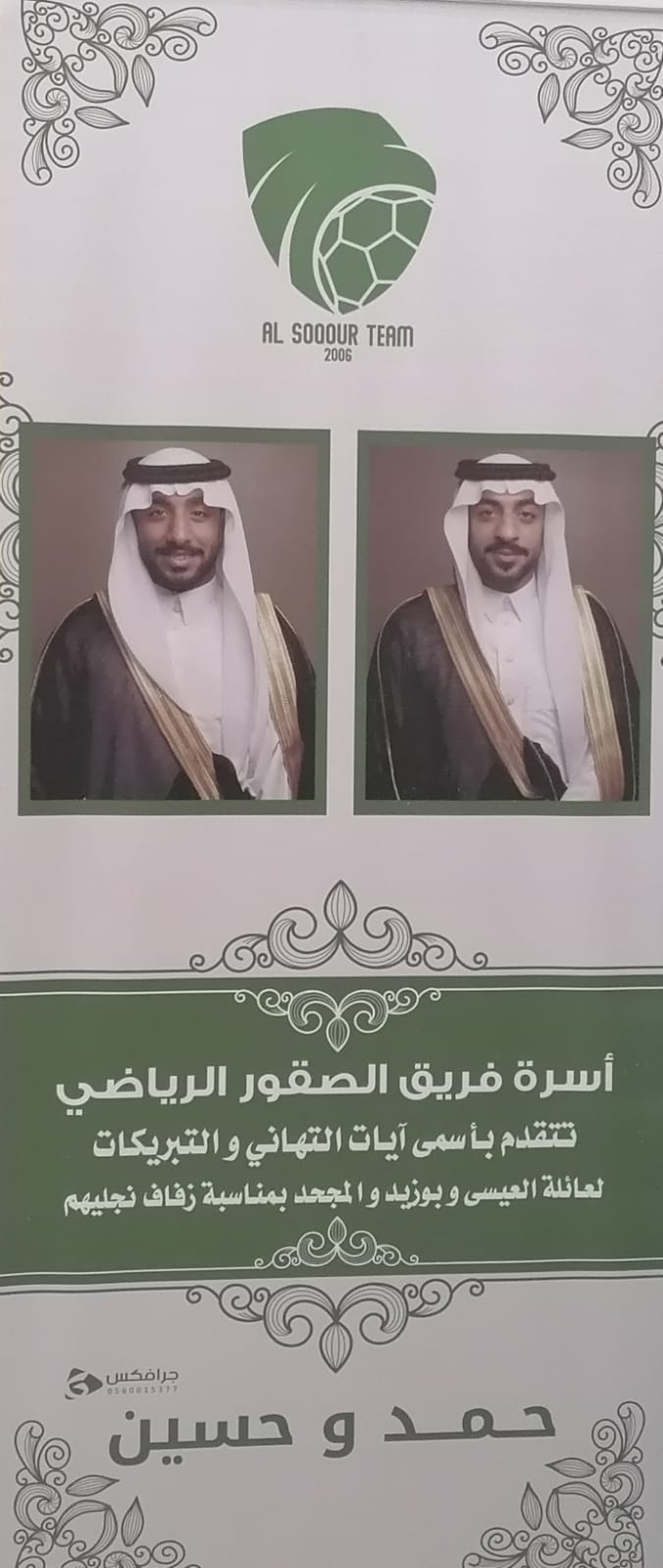 الأول على كريمة الحاج المرحوم - علي بن حبيب المجحد، والثاني على كريمة الحاج المرحوم - طه بن طاهر بوزيد، وذلك في قاعة رجنسي للحفلات والمناسبات بحي الملك فهد بالهفوف - الداخل المحدود - بالأحساء في احتفالية حضر عدد كبير من الاهل والاقارب والاصدقاء والزملاء ومدراء ومسوؤلين على مستوى المنطقة .