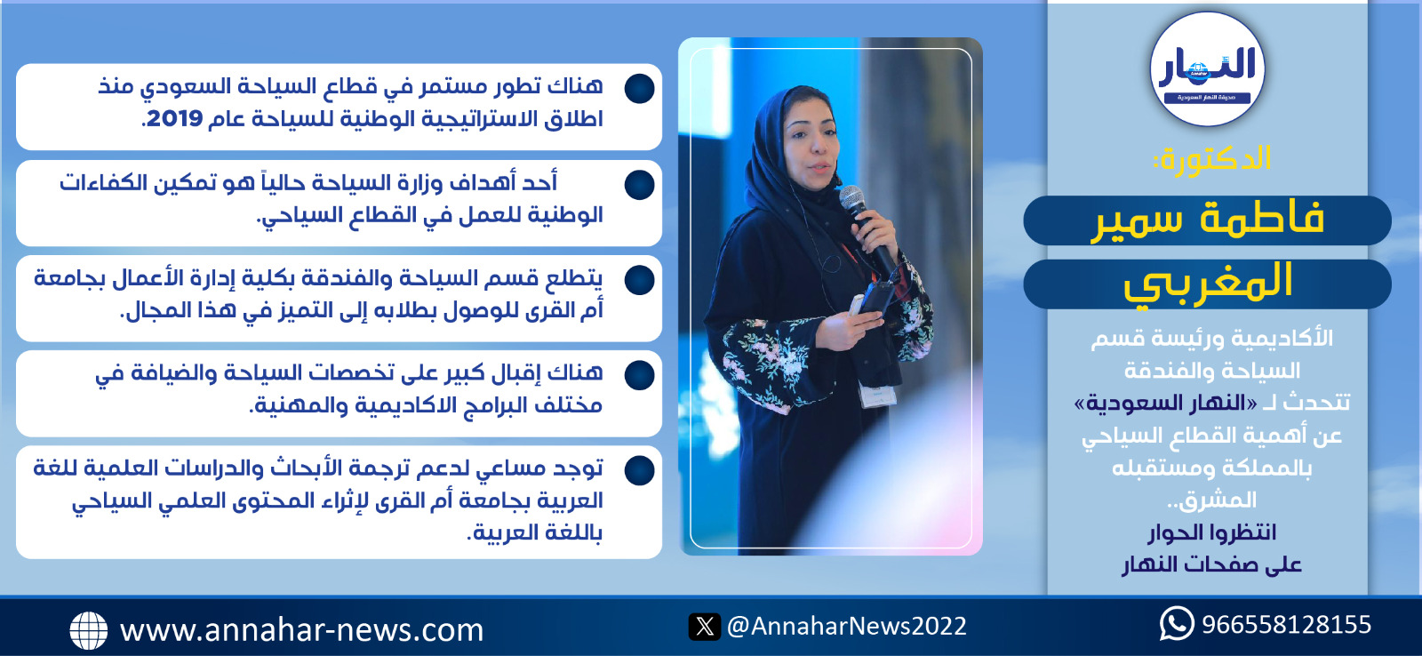 ويسعد صحيفة النهار السعودية أن تستضيف الدكتورة فاطمه المغربي الأكاديمية والتي رحبت بنا وبهذا الحوار عن السياحة ومستقبلها وتطلعاتها وعن عملها الأكاديمي ومدى الإقبال على هذا التخصص وعن المستوى الذي وصلت إليه السياحة لدينا وكم نحتاج من الوقت لسعودة هذا القطاع سيما انه حديث عهد وهو أخذ في التوسع والتطور وطرحنا عليها أيضا عن تساءلنا عن ماهي معاييركم الأكاديمية لهذه المهنة في تجهيز شباب وشابات الوطن لسوق العمل؟ وغيرها من الأسئلة التي سوف نطرحها عليها لاستشراف مستقبل هذا القطاع