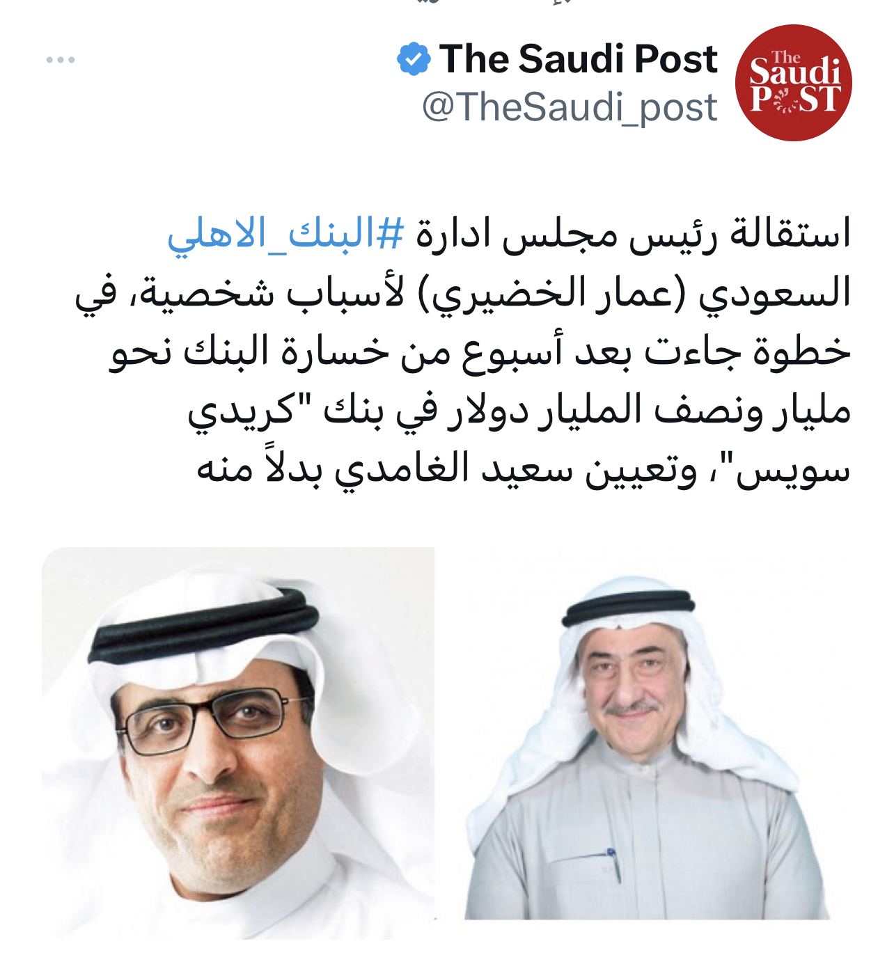 استقالة رئيس مجلس ادارة #البنك_الاهلي السعودي (عمار الخضيري) لأسباب شخصية، في خطوة جاءت بعد أسبوع من خسارة البنك نحو مليار ونصف المليار دولار في بنك "كريدي سويس"، وتعيين سعيد الغامدي بدلاً منه