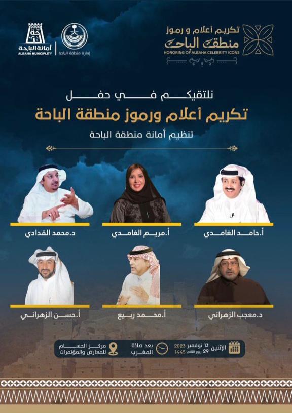 برعاية صاحب السمو الملكي الأمير الدكتور حسام بن سعود بن عبدالعزيز آل سعود، أمير منطقة الباحة، تنظم أمانة منطقة الباحة، يوم الاثنين 29 ربيع الآخر 1445هـ، الموافق 13 نوفمبر 2023م، في قاعة الحسام للمؤتمرات والمعارض، حفل تكريم لعدد من رموز وأعلام منطقة الباحة كفاء ما قدموا من أعمال ومنجزات.