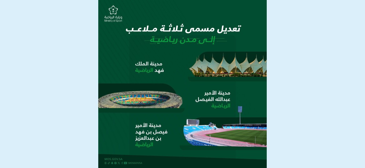 أعلنت وزارة الرياضة اليوم الأحد 19 نوفمبر 2023م، تعديل مسمى ثلاثة ملاعب إلى مدن رياضية؛ وذلك ضمن الخطوات التطويرية التي تعمل الوزارة على تنفيذها، وفق خطط شاملة، تسهم في تحقيق المستهدفات الرياضية في رؤية السعودية 2030.