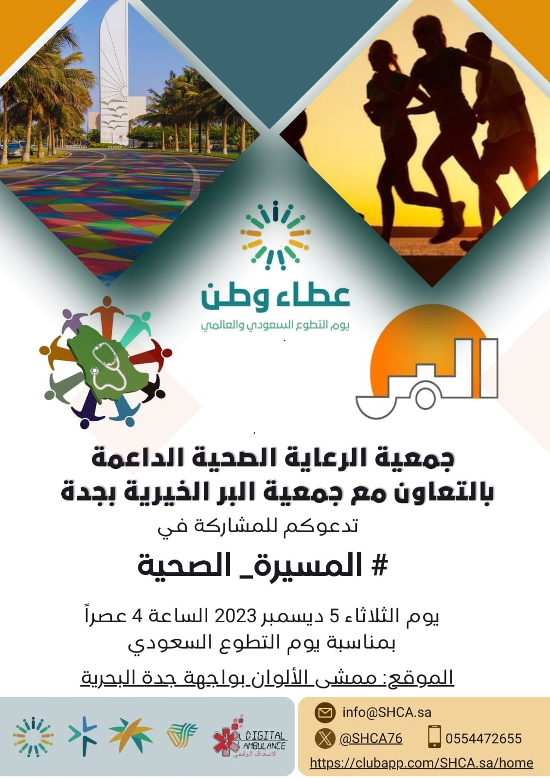 ينظم الشركاء جمعية البر بجدة القسم التطوعي وجمعية الرعاية الصحية الداعمة فعالية #المسيرة_الصحية وذلك يوم الثلاثاء 05 ديسمبر 2023م وذلك في تمام الساعة الرابعة عصرا على ممشى ألوان في الواجهة البحرية بمحافظة جدة.