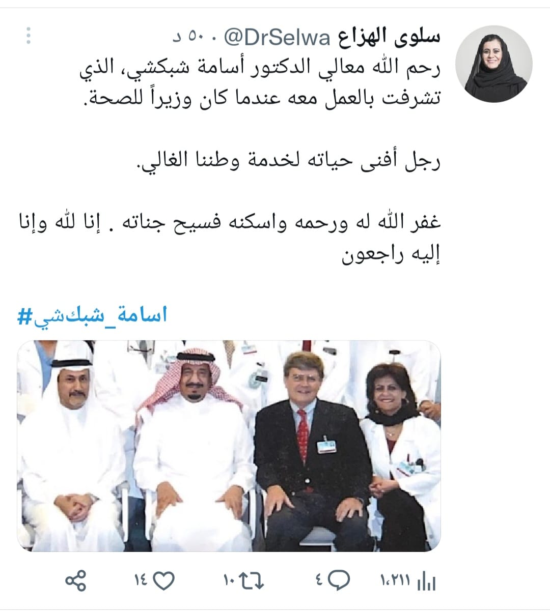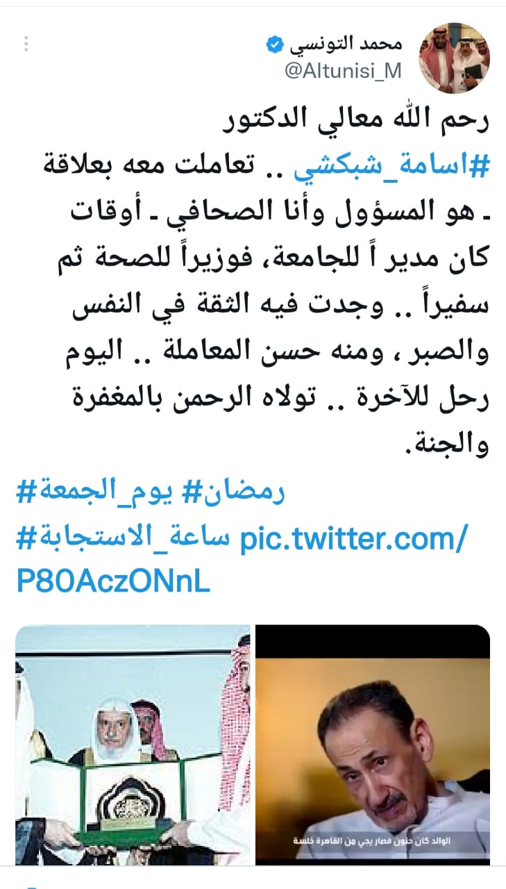 الصحافي محمد التونسي قال: رحم الله معالي الدكتور #اسامة_شبكشي .. تعاملت معه بعلاقة ـ هو المسؤول وأنا الصحافي ـ أوقات كان مدير اً للجامعة، فوزيراً للصحة ثم سفيراً .. وجدت فيه الثقة في النفس والصبر ، ومنه حسن المعاملة .. اليوم رحل للآخرة .. تولاه الرحمن بالمغفرة والجنة.