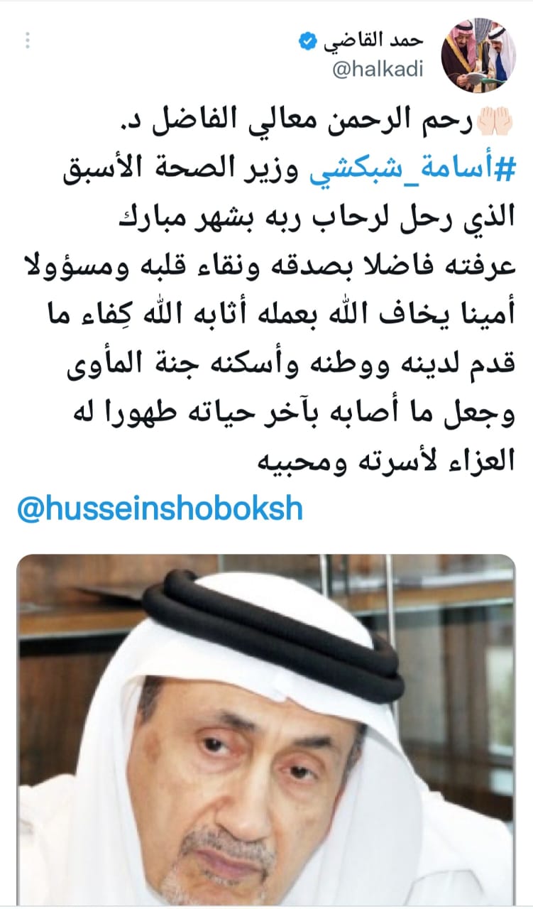 الأديب حمد القاضي قال: رحم الرحمن معالي الفاضل د. #أسامة_شبكشي وزير الصحة الأسبق الذي رحل لرحاب ربه بشهر مبارك.