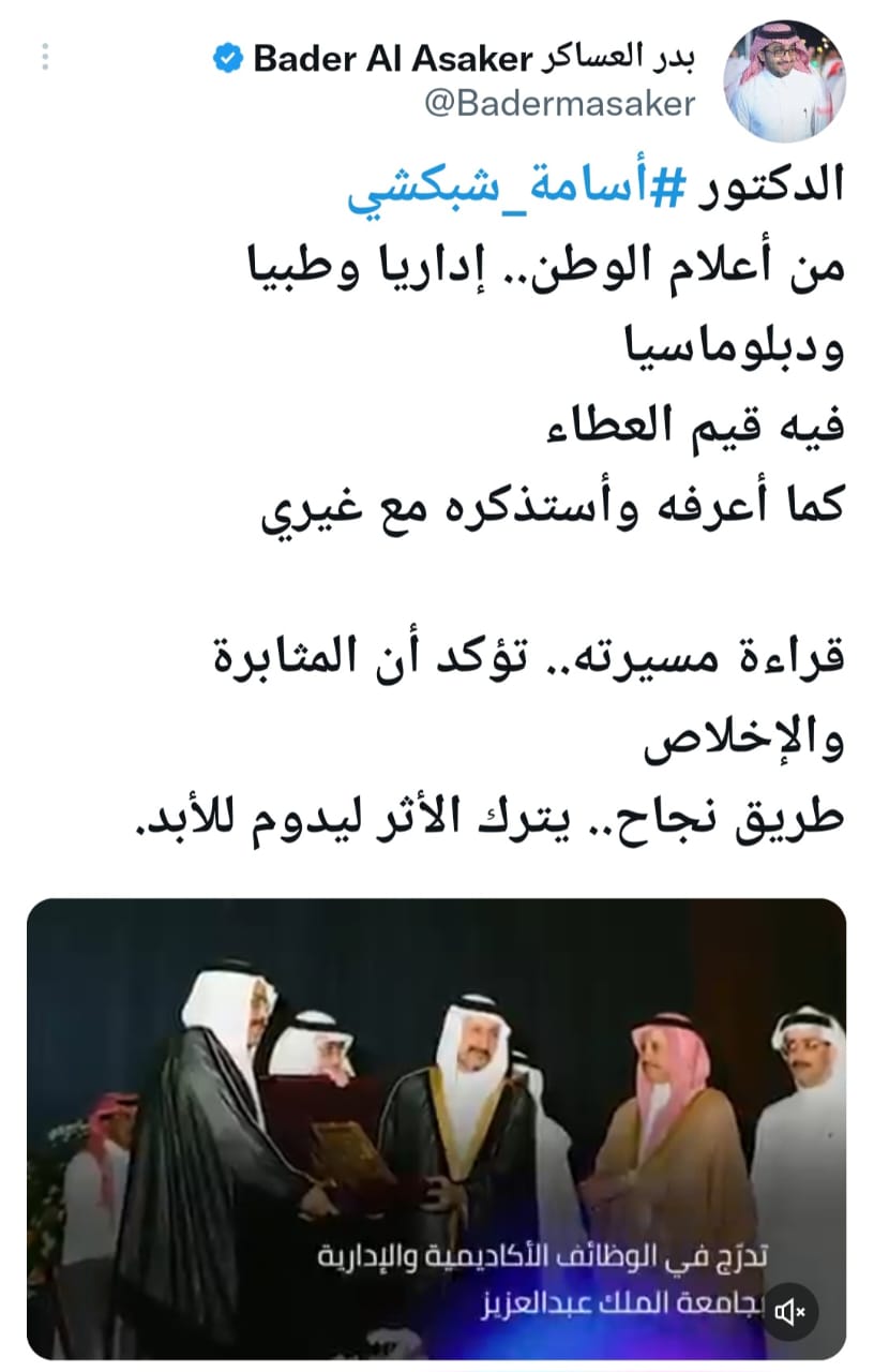 وقال مدير المكتب الخاص لسمو ولي العهد عضو مجلس إدارة مسك بدر العساكر: الدكتور #أسامة_شبكشي من أعلام الوطن.. إداريا وطبيا ودبلوماسيا.. فيه قيم العطاء كما أعرفه وأستذكره مع غيري.