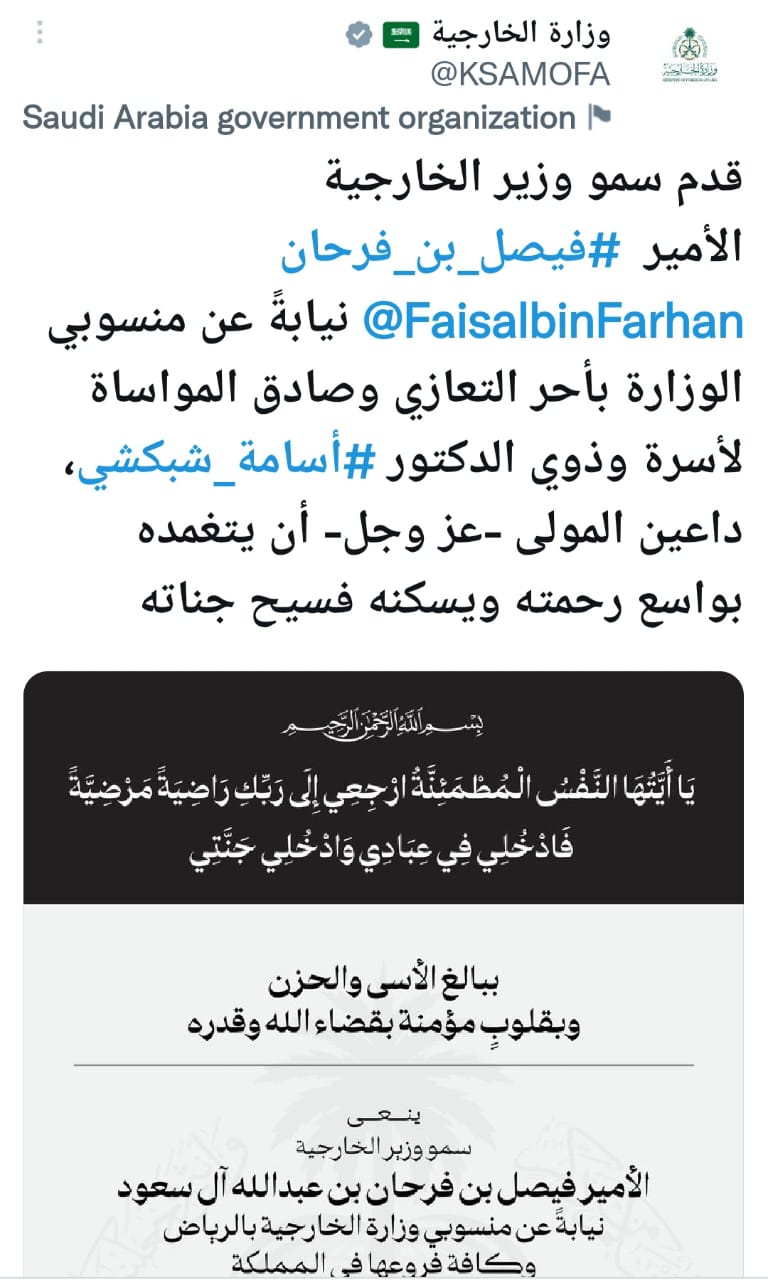ونشر حساب وزارة الخارجية تقديم سمو وزير الخارجية الأمير #فيصلبنفرحان نيابةً عن منسوبي الوزارة أحر التعازي وصادق المواساة لأسرة وذوي الدكتور #أسامة_شبكشي، داعين المولى -عز وجل- أن يتغمده بواسع رحمته ويسكنه فسيح جناته.