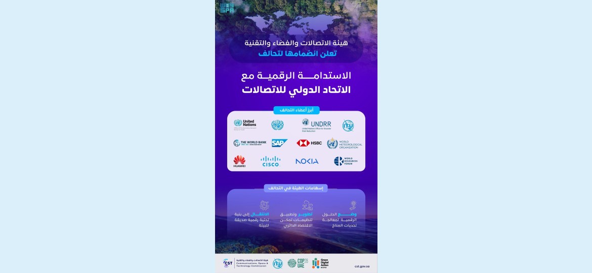 ويضم تحالف الاستدامة الرقمية مع الاتحاد الدولي للاتصالات (ITU) في عضويته عدداً من الكيانات والمؤسسات الدولية على مستوى العالم، ويهدف إلى تحفيز فرص الشراكات وتوسيع نطاق التنسيق مع مجتمع الاتصالات والتقنية للمشاركة في إيجاد ووضع الحلول الرقمية لمعالجة تحديات المناخ، من خلال الانتقال إلى بنية تحتية رقمية تمكن الحلول البيئية المستدامة .