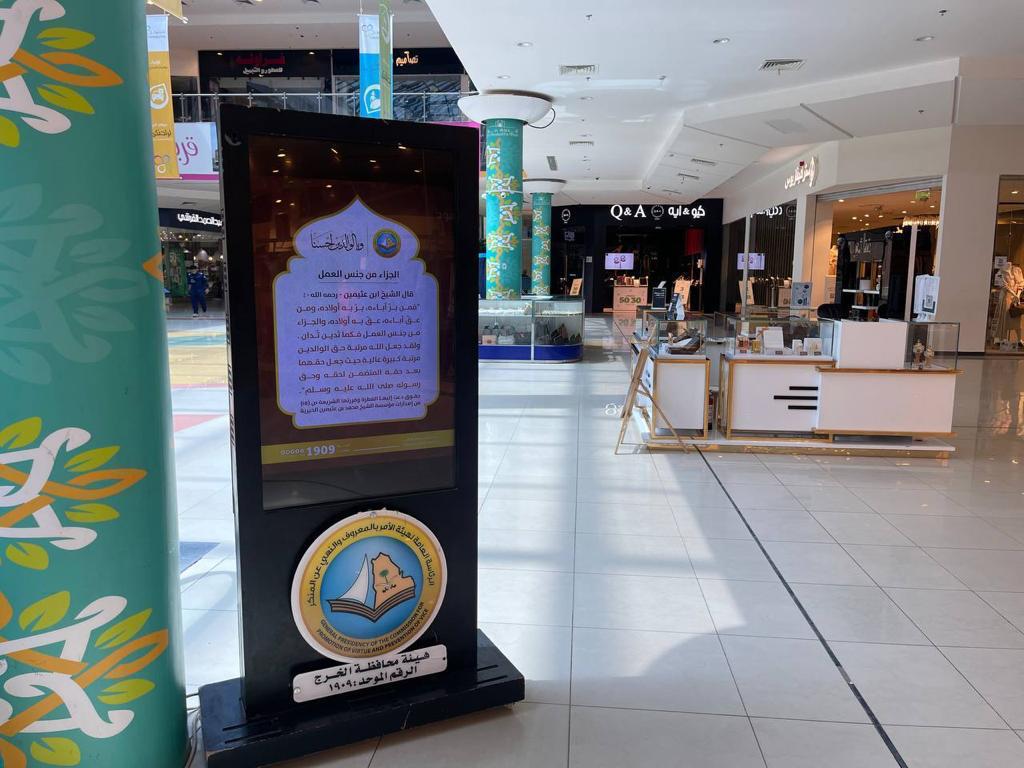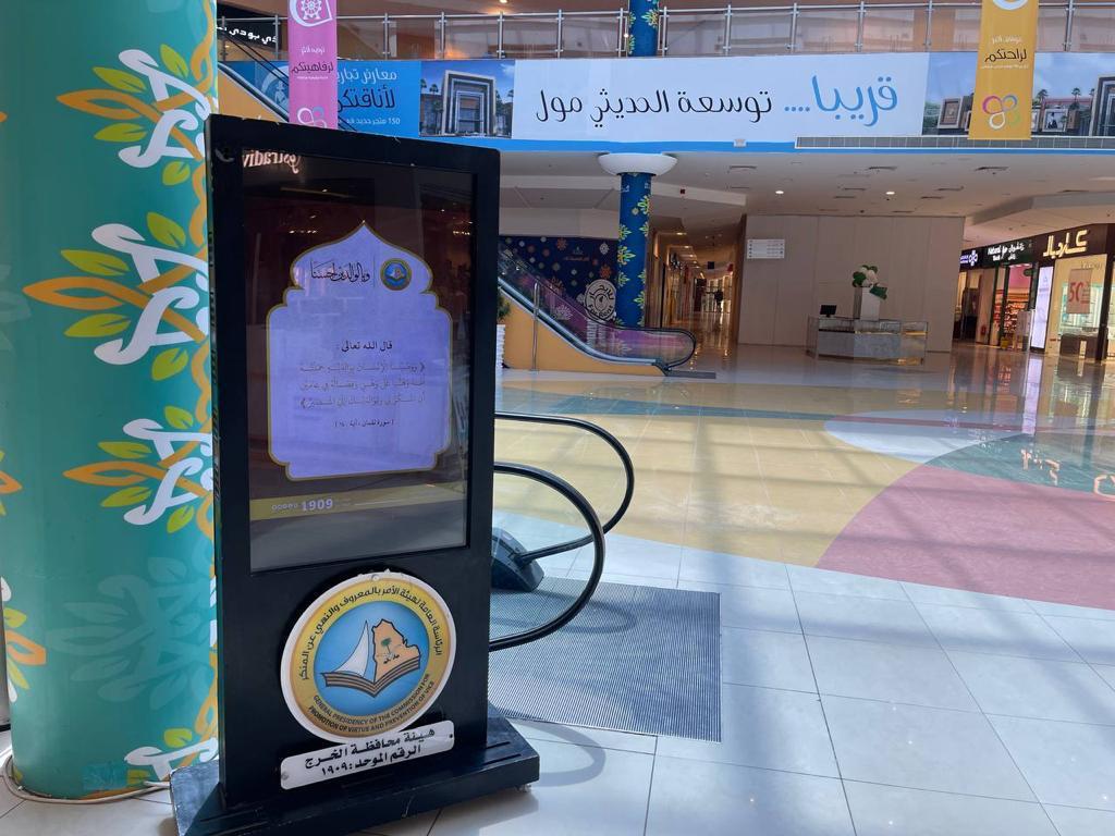 تفعيلاً لجهود الرئاسة العامة لهيئة الأمر بالمعروف والنهي عن المنكر التوعوية والوقائية، واصلت هيئة محافظة الخرج نشر العديد من المناشط والبرامج التوعوية، عبر الشاشات الذكية واللوحات، لتثقيف المجتمع، وتذكيرهم بالخصال الحميدة التي دلت عليها النصوص الشرعية، وفقاً للخطط والبرامج الزمنية، بمتابعة واهتمام فضيلة مدير عام فرع الرئاسة العامة بمنطقة الرياض، الشيخ عبدالله بن محمد الشبانات، لتطبيقها في المنطقة، والمحافظات التابعة.