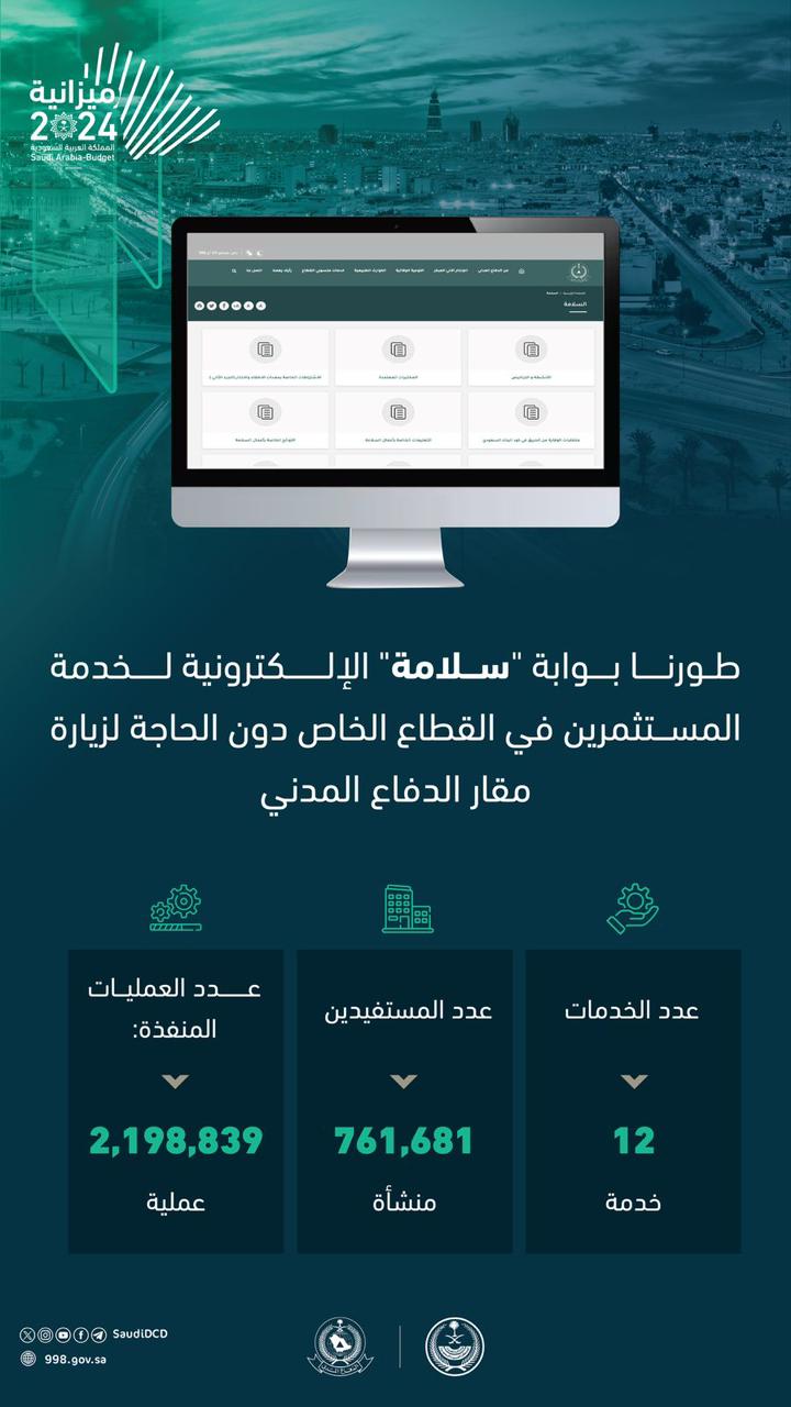 نفذت المديرية العامة للدفاع المدني (2,198,839) عملية عبر (12) خدمة مقدمة لـ (761,681) منشأة في بوابة سلامة الإلكترونية لخدمة المستثمرين في القطاع الخاص حتى عام 2023م.
