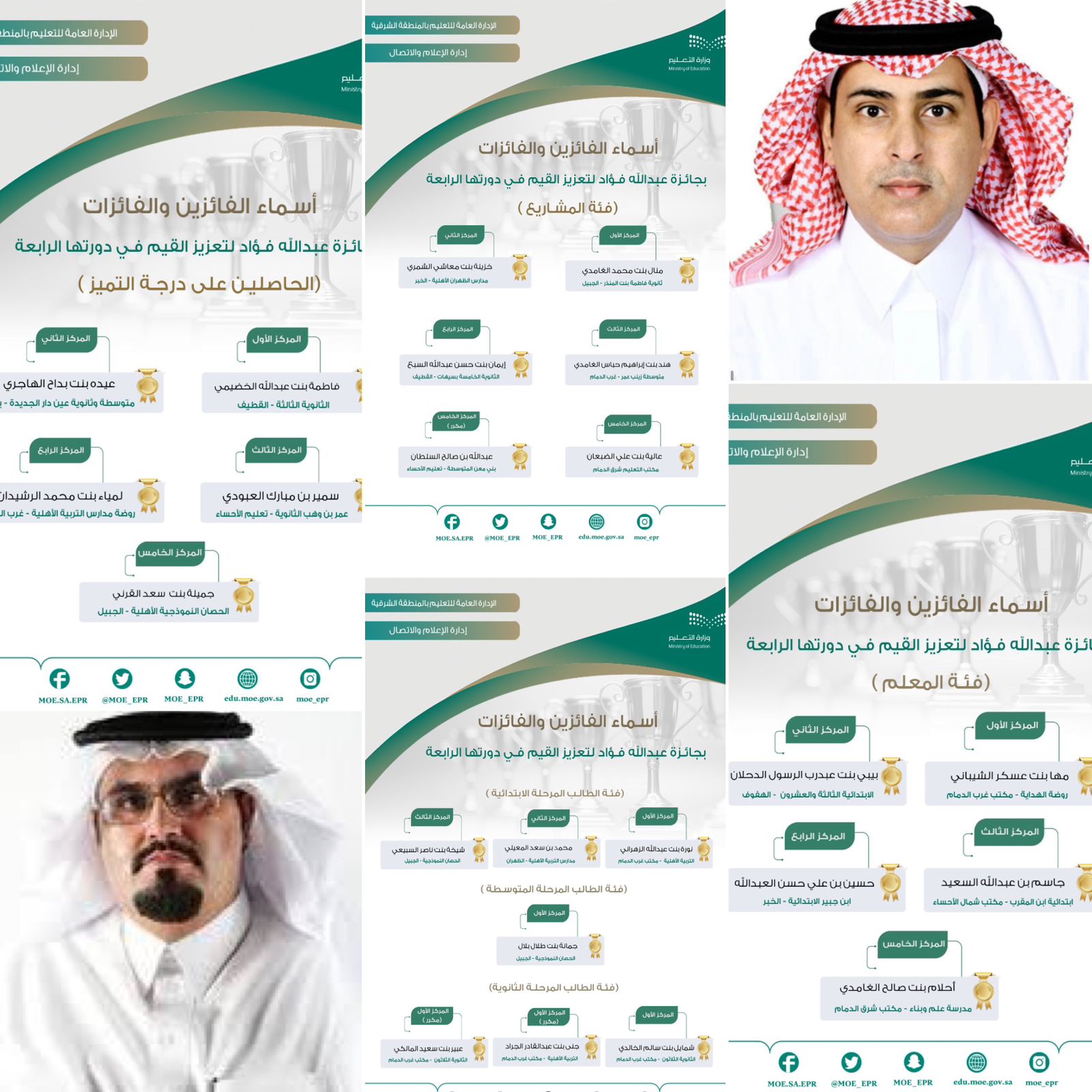 كما لفت الدكتور العتيبي، بمناسبة إعلان نتائج الفائزين والفائزات بجائزة الشيخ عبدالله فؤاد "رحمه الله" لتعزيز القيم في دورتها الرابعة للعام الدراسي 1443/1444هـ ، أن المجتمع التعليمي والتربوي يعتبر البيئة المحققة والمعززة للقيم التي نسعى لتحقيقها في أبناء هذا الوطن المعطاء بوصفه هدف التنمية ووسيلتها ، والذي يحظى دائماً بدعم وافر ومتواصل من قبل حكومتنا الرشيدة "وفقها الله"، وعلى رأسها مولاي خادم الحرمين الشريفين الملك سلمان بن عبد العزيز آل سعود، وسمو ولي عهدة الأمين صاحب السمو الملكي الأمير محمد بن سلمان بن عبد العزيز آل سعود "يحفظهم الله"، وأضاف خير شاهد على ذلك ما يحظى به مجتمعنا التعليمي والتربوي في المنطقة الشرقية من اهتمام ودعم متواصل من قبل صاحب السمو الملكي الأمير سعود بن نايف بن عبد العزيز أمير المنطقة الشرقية، وسمو نائبه صاحب السمو الملكي الأمير أحمد بن فهد بن سلمان بن عبد العزيز "حفظهم الله" .