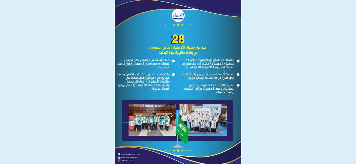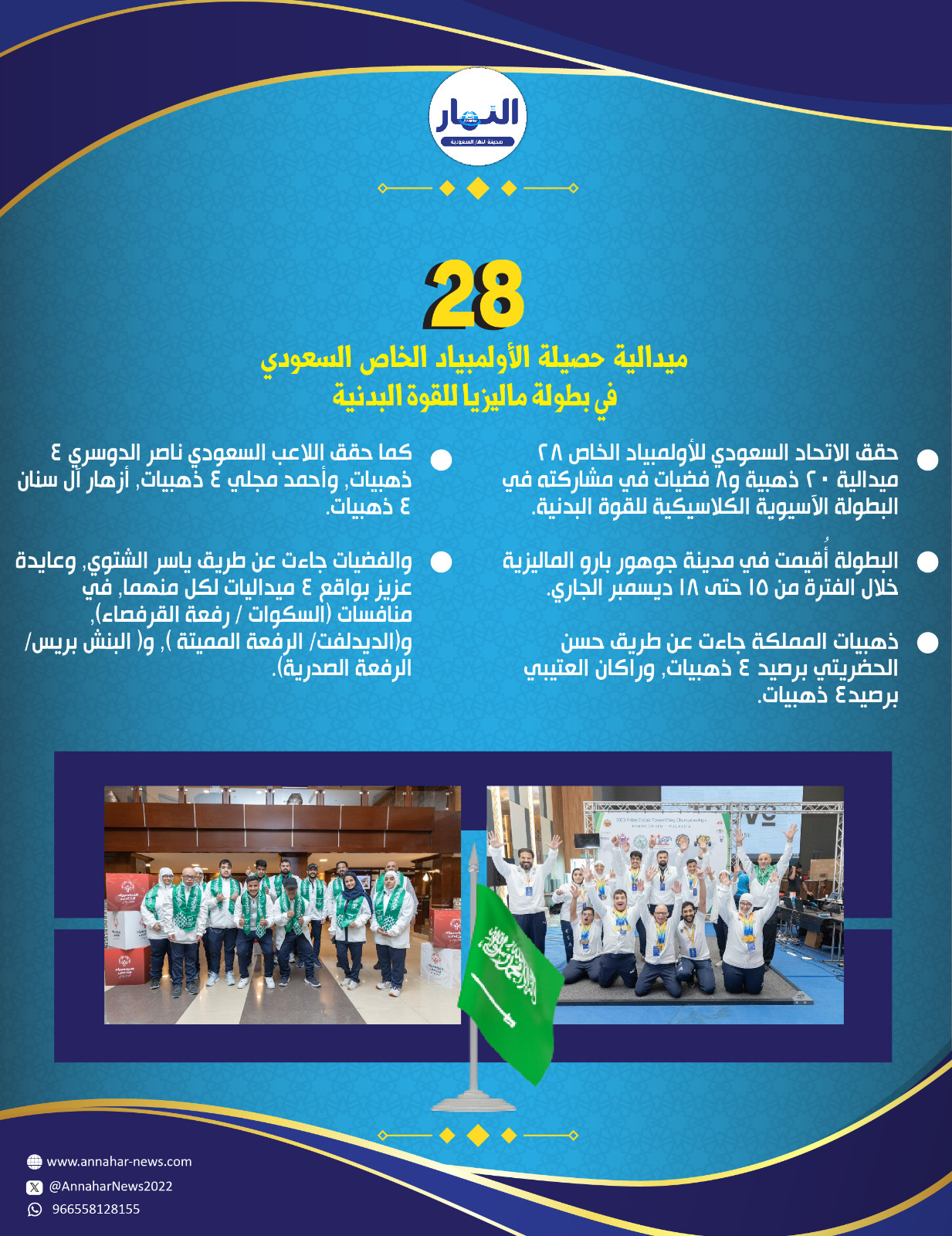 حقق الاتحاد السعودي للأولمبياد الخاص 28 ميدالية "20 ذهبية و8 فضيات"، خلال مشاركته في البطولة الآسيوية الكلاسيكية للقوة البدنية التي استضافتها مدينة جوهور بارو الماليزية خلال الفترة من 15 حتى 18 ديسمبر الجاري.