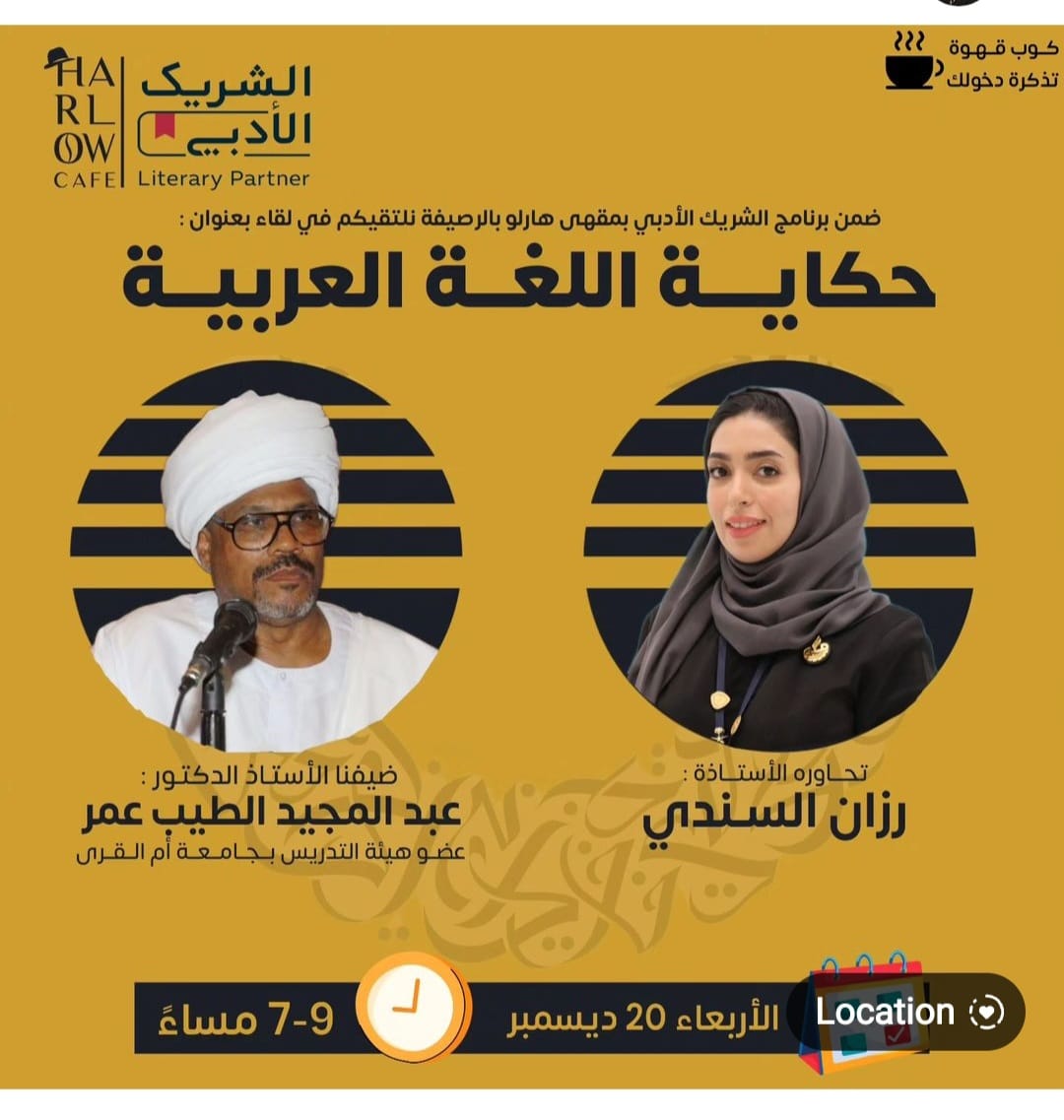 أحيا البروفسور عبدالمجيد الطيب عمر أمسية ثرية عن اللغة العربية بمقهى هارلو بحي الرصيفة بمكة يوم امس الأربعاء الموافق ٢٠ ديسمبر بالتعاون مع الشريك الأدبي وكان عنوان المحاضرة "حكاية اللغة العربية" هذا العنوان الذي حوى على كل التفاصيل عن هذه اللغة وهي تعيش في أيامها وأجوائها الإحتفائية من الثامن عشر من الشهر الحالي ديسمبر وأدارت الحوار بكل إقتدار الإعلامية والكاتبة رزان سندي والتي دائما ماتجعل من الحوار يرقى لمستوى الشخصية المحاضرة أمامها فما بالنا بقامة علمية مثل البروفسور والذي دائما مايدهشنا بهذا الكم الهائل من المعلومات والإستنتاجات المذهلة عن هذه اللغة العظيمة والبروفسور إستهل محاضرته عن ماتميزت به اللغة العربية مقارنة باللغة الإنجليزية كمثال وهي التي طغت على اللغات الأخرى في لغة التخاطب فذكر البروفسور بأن اللغة الإنجليزية لاتفرق بين الذكر والأنثى والجمع في التخاطب مثل إسم الإشارة "You" يستخدم للجميع ولايفرق بينها بينما اللغة العربية هي لغة البيان والوضوح فالذكر يختلف في التخاطب عن الأنثى وهذه ميزة ميزتها حتى أنه ذكر النظام الصوتي في اللغة العربية فهي تستخدم فيها عدة اصوات للتمييز بين الحروف فهذا غير موجود في لغات واردف قائلا بأن الحركات هي بحد ذاتها أصوات بينما قارن بلغات أخرى فذكر بأنه لايوجد بها أصوات مما أضر بهذه اللغات وزادها غموضاً وعدم الوضوح وتسببت هذه العلة بأضرار كبيره عليها وخلص للقول بأن اللغة العربية تميزت عن غيرها من اللغات بما فيها اللغة الإنجليزية ببيانها واصواتها وماذكره في محاضرته هو مدون بأحد مؤلفاته القيٌمة وهو كتاب "منزلة اللغة العربية بين اللغات المعاصرة دراسة تقابلية" الذي يعد من الكتب ذات المرجعية عن خصائص اللغة العربية ولاسيما بأن هذا العلامة جمع بين لغتين بأرفع الدرجات العلمية وهو تخصصه الأساسي في اللغة الإنجليزية وحصل لاحقا على درجة الدكتوراه في اللغة العربية و ماحصوله على هذه الدرجة إلا من أجل خدمتها لتبيان عظمة هذه اللغة حين إستشهد بالأية الكريمة في قوله عزوجل:{ الرَّحْمَٰنُ عَلَّمَ الْقُرْآنَ خَلَقَ الْإِنسَانَ عَلَّمَهُ الْبَيَانَ } فحينها أنهت المحاورة هذه الأمسية وشكرت فيها راعي الأمسية على هذا الكم النوعي من المعرفة وهذا التدفق العلمي الذي أفاد به حضور الأمسية وكانت الأستاذة رزان سندي كعادتها متألقة بطريقة طرحها للأسئلة على المحاضر فأثنى عليها البروفسور بأسلوبها الذكي في الطرح وأفسحت المجال للحضور بالمدخلات لطرحها على الضيف فكانت أمسية رائعة وزادها بهاءاً وألقاً البروفسورعبدالمجيد والمحاورة القديرة رزان سندي وكان القائمين على المقهى ومعهم المشرف على النشاط الثقافي الأستاذ عمر قاضي عملوا على تهيئة الأجواء لهذه المحاضرة وتميز هذا المقهى بهدوئه وجمالياته في الديكور