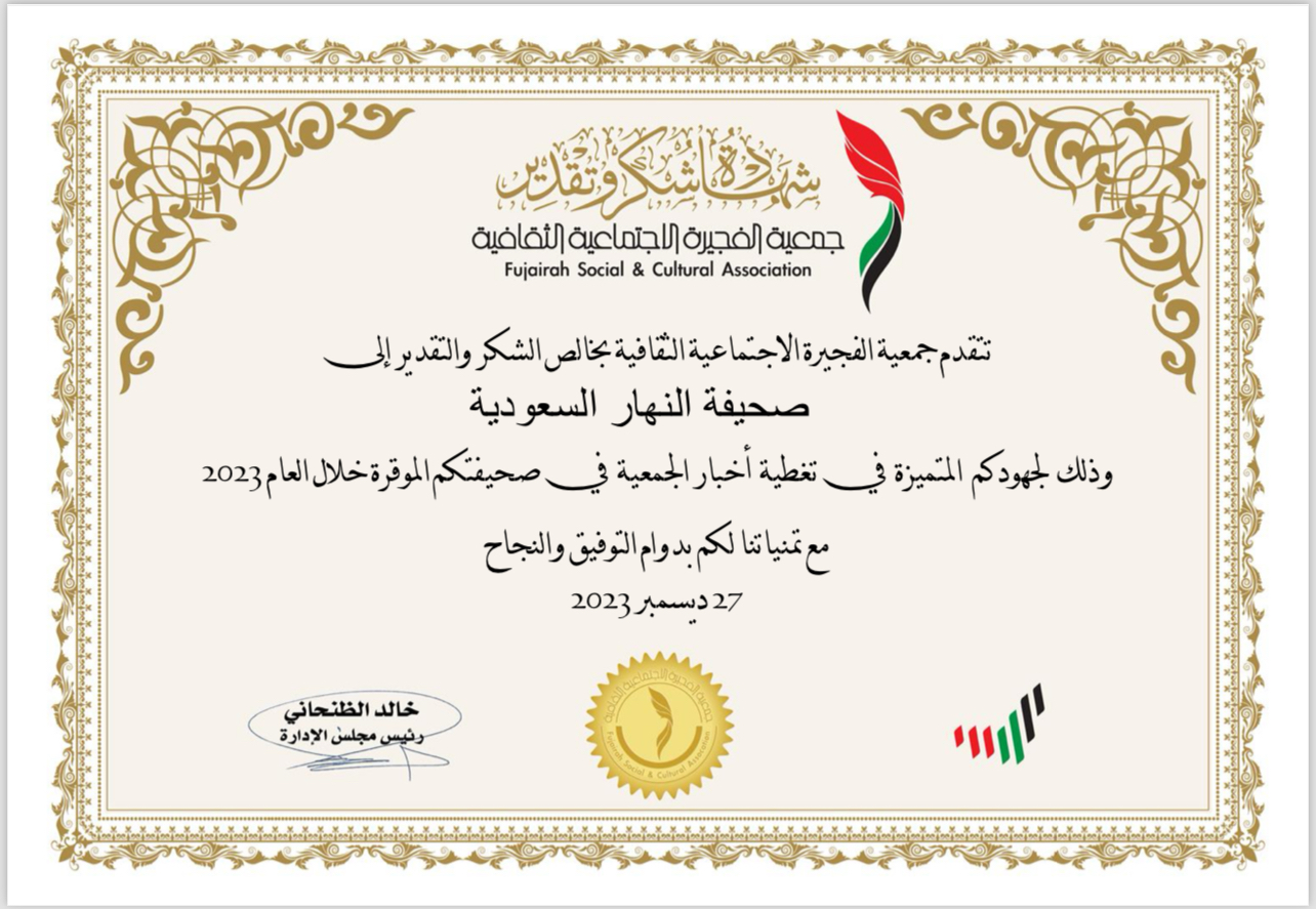 كرّمت جمعية الفجيرة الثقافية الإجتماعية بدولة الإمارات صحيفة النهار السعودية بشهادة شكر وتقدير، وذلك لجهود الصحيفة المتميزة في تغطية أخبار الجمعية طوال عام 2023.