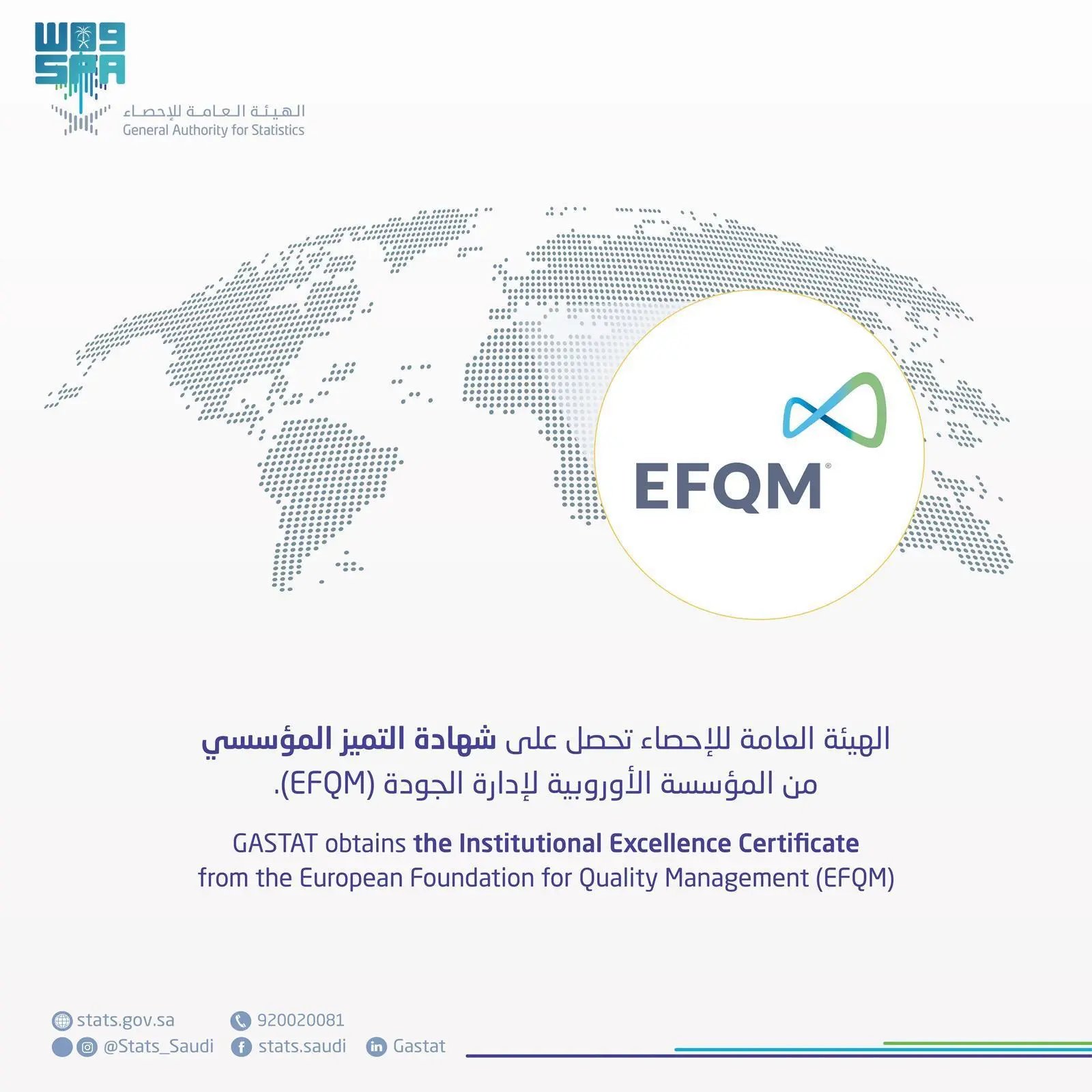 حصلت الهيئة العامة للإحصاء على شهادة التميز المؤسسي من المؤسسة الأوروبية لإدارة الجودة على مستوى التأهيل (qualified by EFQM)، وذلك بعد تحقيقها تقدمًا في الالتزام بنموذج المؤسسة الأوروبية لإدارة الجودة وفق مقياس (RADAR)، وذلك من خلال تطبيق معايير التميز المؤسسي التي وضعتها المؤسسة والتي تتوافق مع توجهات رؤية السعودية 2030.