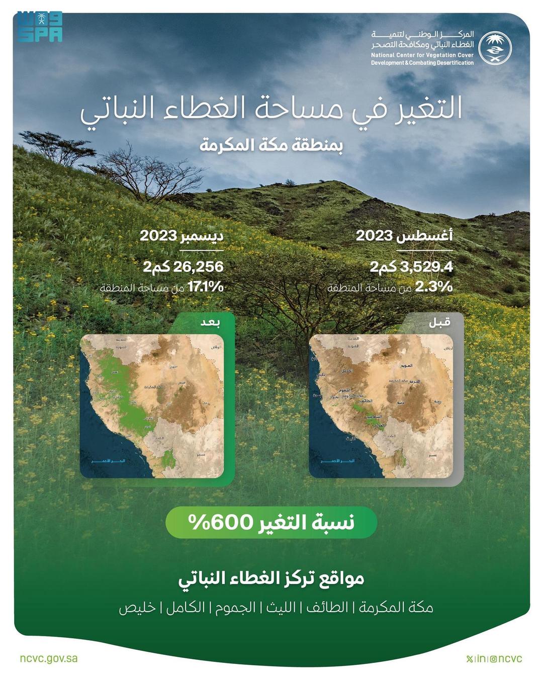 أعلن المركز الوطني لتنمية الغطاء النباتي ومكافحة التصحر، عن زيادة مساحات الغطاء النباتي في منطقة مكة المكرمة بنسبة بلغت 600% خلال الأشهر الخمسة الأخيرة، بدايةً من أغسطس 2023 إلى ديسمبر، بسبب الحالة المطرية في هذه الفترة التي وصلت معدلاتها إلى 200 ملم في بعض المواقع.