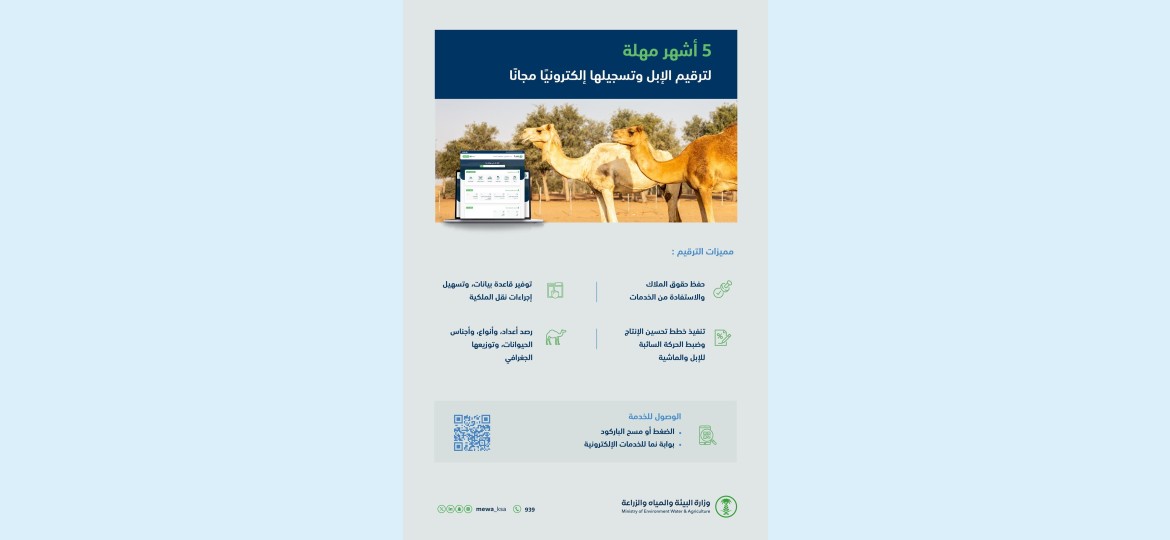 يُشار إلى أن الوزارة كانت قد أطلقت في وقتٍ سابق، خدمة طلب ترقيم الثروة الحيوانية وتسجيلها إلكترونيًا؛ للإسهام في توفير بيانات دقيقة عنها في جميع مناطق المملكة، مما ينعكس إيجابًا على أهميتها الاقتصادية، والبيئية، والحيوية.