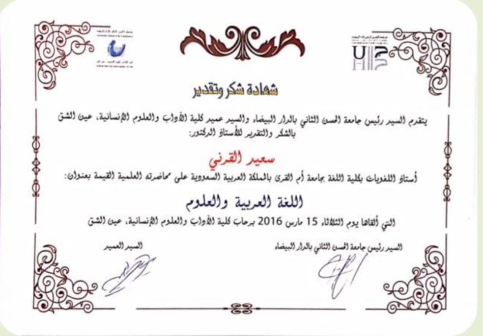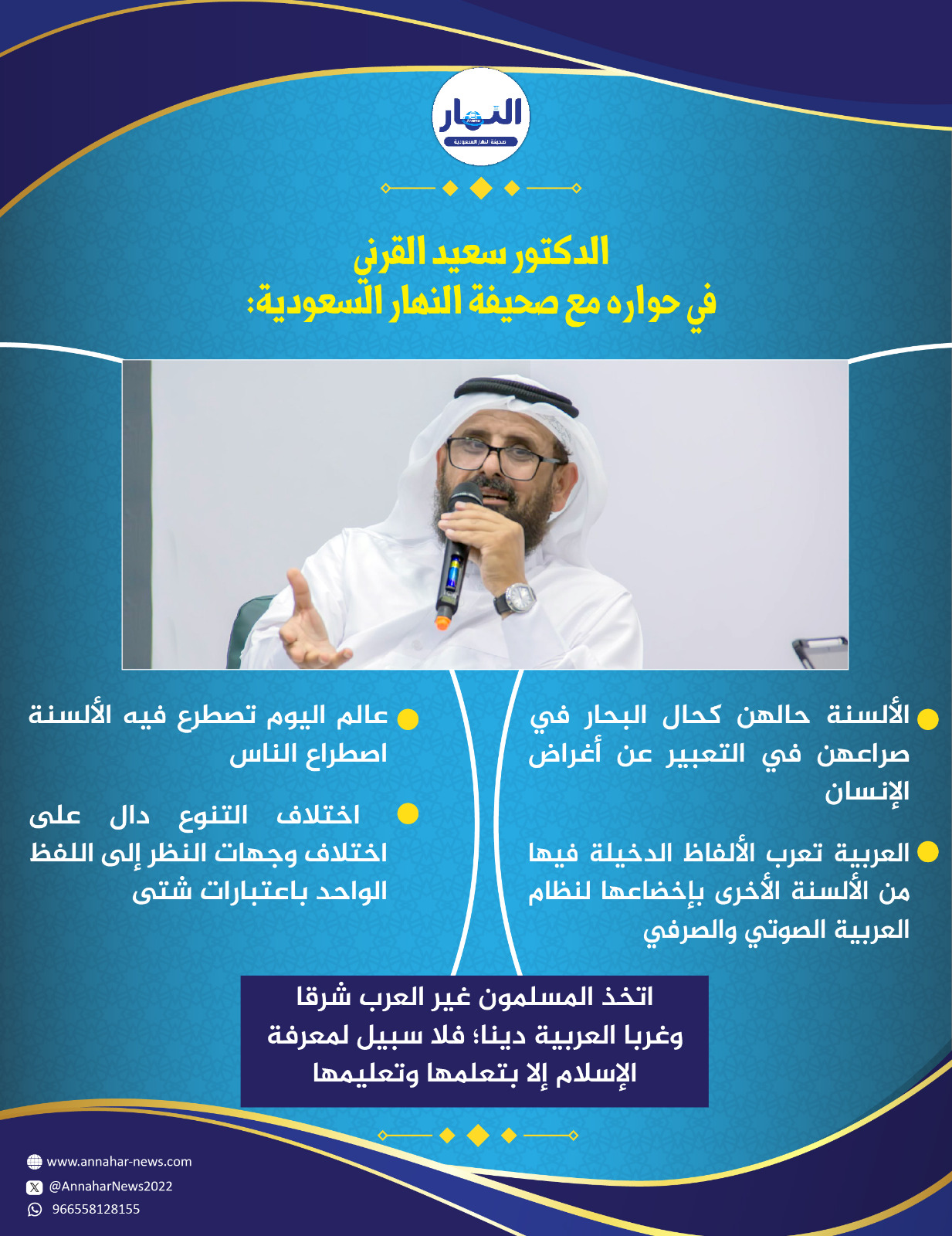 تلك الشخصية التي أخذت على عاتقها هذه اللغة لأجل رفعتها ونافحت ودافعت وناقشت في سبيلها الشيئ الكثير فضيفنا هو الدكتور سعيد بن محمد القرني والذي أستطيع أن اسميه المهموم بلغته لأنه نذر نفسه في هذا الشأن والدكتور سعيد ذو خلق رفيع وهو شخصية تنجذب إليها ويأنس الشخص بمجالستها لسعة معرفته وثقافته لفصاحة لسانه وحُسن بيانه ناهيك عن علمه والذي يعد أبرز القامات بعد جيل عمالقة اللغة العربية لدينا في وطننا مثل الدكتورحسن باجودة والدكتور محمد بن مريسي الحارثي والدكتورعبدالعزيزالمانع والدكتورعياد الثبيتي والدكتور محمود زيني وغيرها من الأسماء البارزة في علم اللغة العربية وله إسهامات جليلة بحثية ومعه نخبة من الأكاديميين المتميزين في اللغة العربية وهما الأستاذة الدكتوره حصّة الرّشود من جامعة أمّ القرى والأستاذ الدكتور أحمد كرّوم من المغرب الشقيق والذي درس بجامعة أمّ القرى و بجامعة ابن زهر بأغادير لإصدار مؤلف بعنوان: "التّفاعل بين الهوّيّة ولغة التّعليم" مشاركين في تأليفه وهو يعتبر من الإصدارات المهمة والقيّمة في علم اللغة العربية والذي يتضمن تشخيص حالة لغة التعليم في الوطن العربي في مراحلة المختلفة من هوّيّته اللسانيّة والإنسانيّة أما سيرته العلمية فهي سجل حافل ومشرف منذ أن كان فتى يافعا بقريته سبت العلاية الوادعة في ريف السراة الجميل ودرس فيها مراحل التعليم العام الثلاثة وإنتقل لمكه لكي يكمل تعليمه الجامعي بكلية اللغة العربية بجامعة أم القرى تلك الكلية التي تعتبرأحد أعرق كليات اللغة العربية في العالم العربي برموزها وطموح ضيفنا العلمي لم يتوقف بل إزداد شغفه بالعلم وفي هذه اللغة العظيمة فحصل على درجتي الماجستير والدكتوراه من هذه الجامعة فأنكب حينها على التأليف والبحوث في محراب العلم وكان له حضوره اللافت في كل مناشط اللغة العربية من محاضرات ومؤتمرات وندوات فتجد له أيضاً حضور في وسائل الإعلام بنوعيه التقليدي والجديد إضافة لكونه عضو بمجمع اللغة العربية بمكة المكرمة وغيرها من اللجان المختصة في اللغة والثقافة فيسعد صحيفة النهاران تلتقي بالدكتور سعيد القرني في هذا الحوار الموسع والممتع والذي لبى دعوتنا مشكوراً