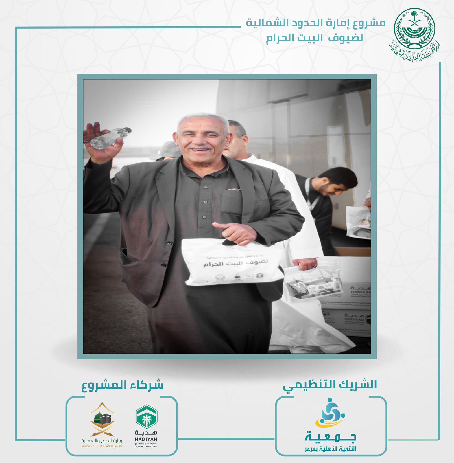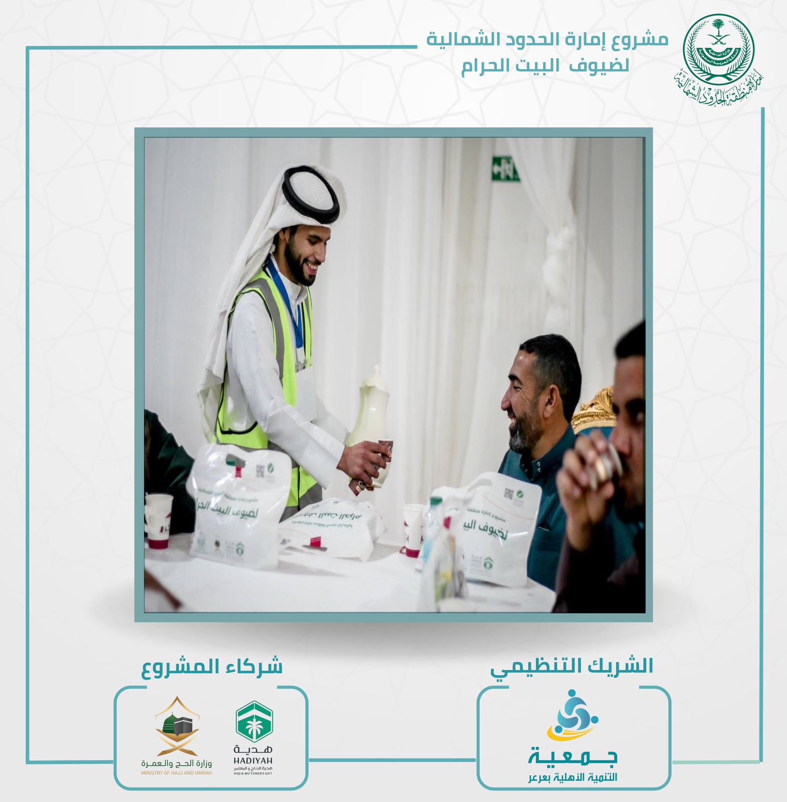 يبذل الشريك التنظيمي جمعية التنمية الاهلية في عرعر جهود تطوعية كبيرة في مشروع إمارة منطقة الحدود الشمالية لضيوف البيت الحرام القادمين من دولة العراق الشقيق عبر منفذ جديدة عرعر بالتعاون مع شركاء العمل وزارة الحج و جمعية هدية الحاج والمعتمر وما تزال مستمرة في الميدان خلال شهر رمضان المبارك .