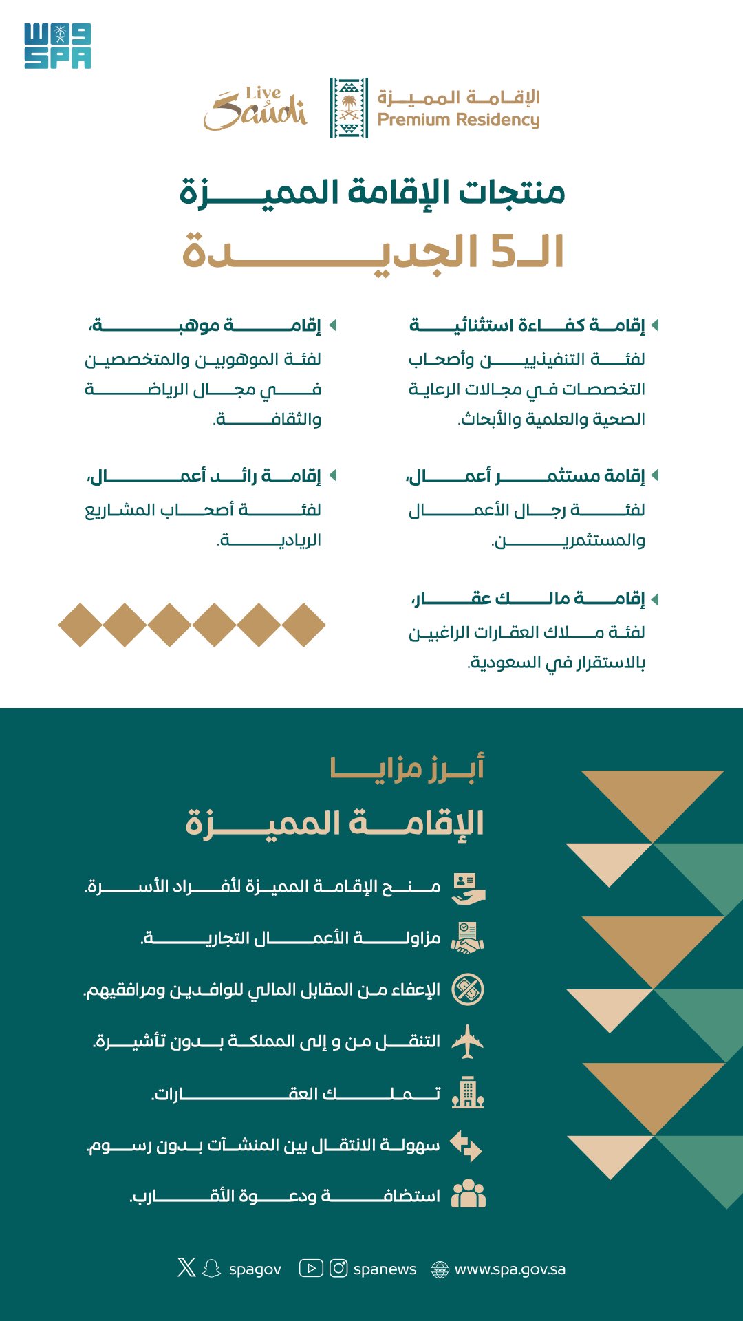 وأعلن الحساب الرسمي للإقامة المميزة على منصة "إكس": " إطلاق 5 منتجات جديدة للإقامة المميزة بهدف تعزيز مكانة السعودية كمركز عالمي يجذب أفضل العقول والاستثمارات وتمكين الاقتصاد الوطني من خلال خلق الوظائف ونقل المعرفة".