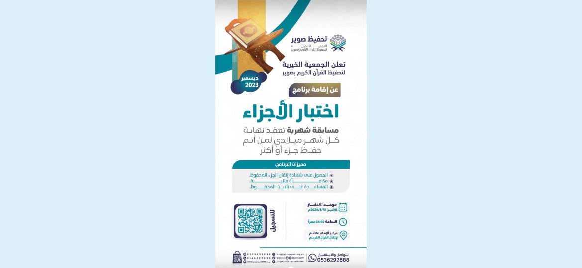 أعلنت الجمعية الخيرية لتحفيظ القرآن الكريم بمحافظة صوير بمنطقة الجوف ، عن إقامة برنامج المسابقة الشهرية “اختبار الأجزاء” والتي تعقد نهاية كل شهر ميلادي، لمن أتم حفظ جزء أو أكثر من كتاب الله وتشمل مميزات البرنامج الحصول على شهادة إتقان الجزء المحفوظ،ومكافأة مالية،