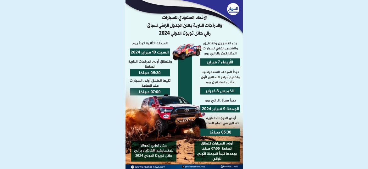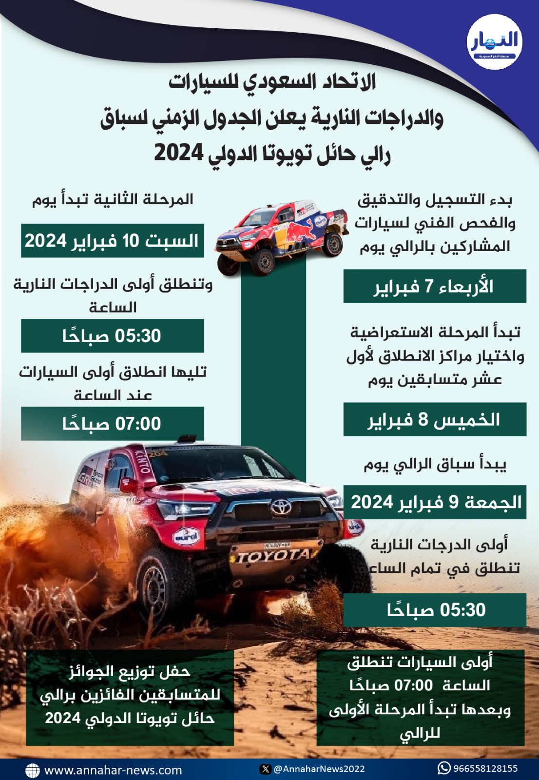 كشفت الاتحاد السعودي للسيارات والدراجات النارية عن موعد بدء التسجيل والتدقيق والفحص الفني لسيارات المشاركين بالرالي يوم الأربعاء 7 فبراير، وذلك من خلال إصداره للبرنامج الزمني للرالي، والذي يشمل المؤتمر الصحفي "الافتتاحي" واجتماع السائقين في اليوم نفسه.