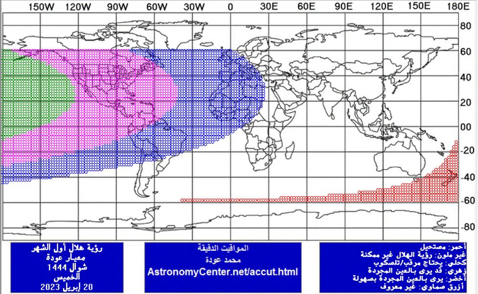 أوضح المهندس محمد شوكت عودة مدير مركز الفلك الدولي أن دول العالم الإسلامي ستتحرى هلال شهر شوال (عيد الفطر 1444 هـ) يوم الخميس 20 إبريل/نيسان 2023م، ورؤية الهلال في ذلك اليوم غير ممكنة بالعين المجردة أو بالتلسكوب من جميع قارة آسيا وأستراليا، في حين أنها ممكنة باستخدام التلسكوب فقط وبصعوبة من الأجزاء الغربية من قارة أفريقيا وأوروبا. وهي ممكنة بالعين المجردة بصعوبة في الأجزاء الغربية من القارتين الأمريكيتين.