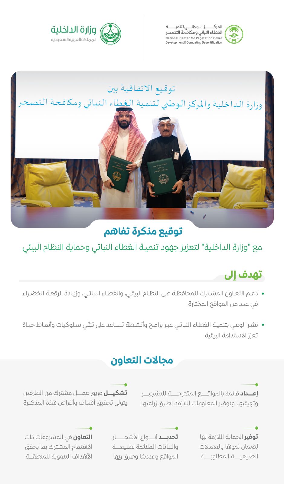وقع المركز الوطني لتنمية الغطاء النباتي ومكافحة التصحر مذكرة تفاهم مع وزارة الداخلية لتعزيز التعاون المشترك والعمل التكاملي بين الطرفين، لزيادة الغطاء النباتي من خلال أعمال التشجير في 476 موقعا مختارة في كافة المناطق، تفعيلاً للإجراءات والتدابير اللازمة للحفاظ على النظام البيئي في المملكة.
