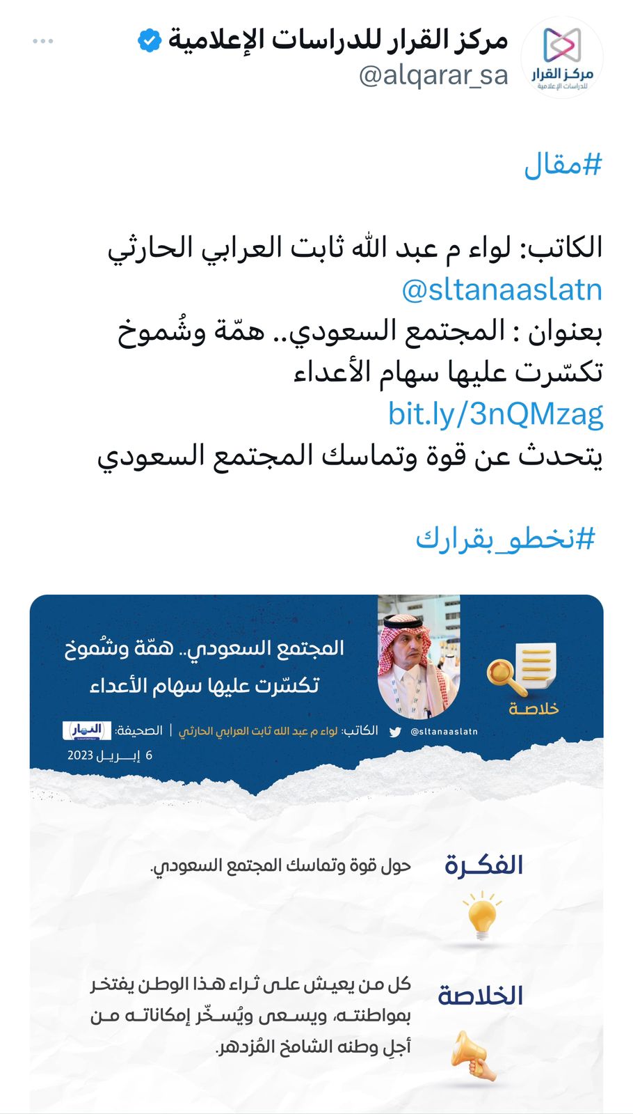 تناول مركز القرار للدراسات الإعلامية بالتحليل للفكرة والمضمون ، مقال الكاتب بصحيفة النهار السعودية ،اللواء.م.عبدالله بن ثابت العرابي الحارثي، وقد لخص الدراسة على موقعة على الشبكة المعلوماتية (تويتر)مبينا أن المضامين التي تناولها الكاتب في مقالة تحت عنوان (المجتمع السعودي.. همّة وشُموخ تكسّرت عليها سهام الأعداء)، وأشار التحليل إلى أن فكرة المقال تتمحور حول قوة وتماسك الشعب السعودي، وخلص التحلي إلى أن كل من يعيش على ثراء هذا الوطن يفتخر بمواطنته،ويسعى ويُسخّر إمكاناته من أجلِ وطنه الشامخ المُزدهر ..
