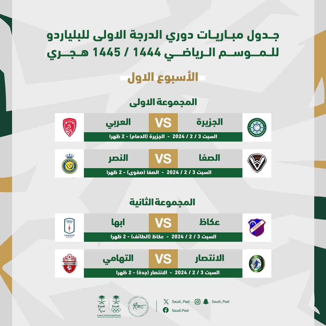 وينطلق كذلك يوم غدا السبت منافسات الجوله الأولى من دوري الاندية للبلياردو للدرجة الأولى حيث يشارك في دوري الدرجة الأولى 10 اندية تم وضعها في مجموعتين وتقام غدا 4 مواجهات وتضم المجموعة الأولى اندية " النصر ، الشعلة ، الصفا ، العربي ، الجزيرة " فيما تضم المجموعة الثانية اندية " أبها ، الوطني ، عكاظ ، الانتصار ، التهامي ".
