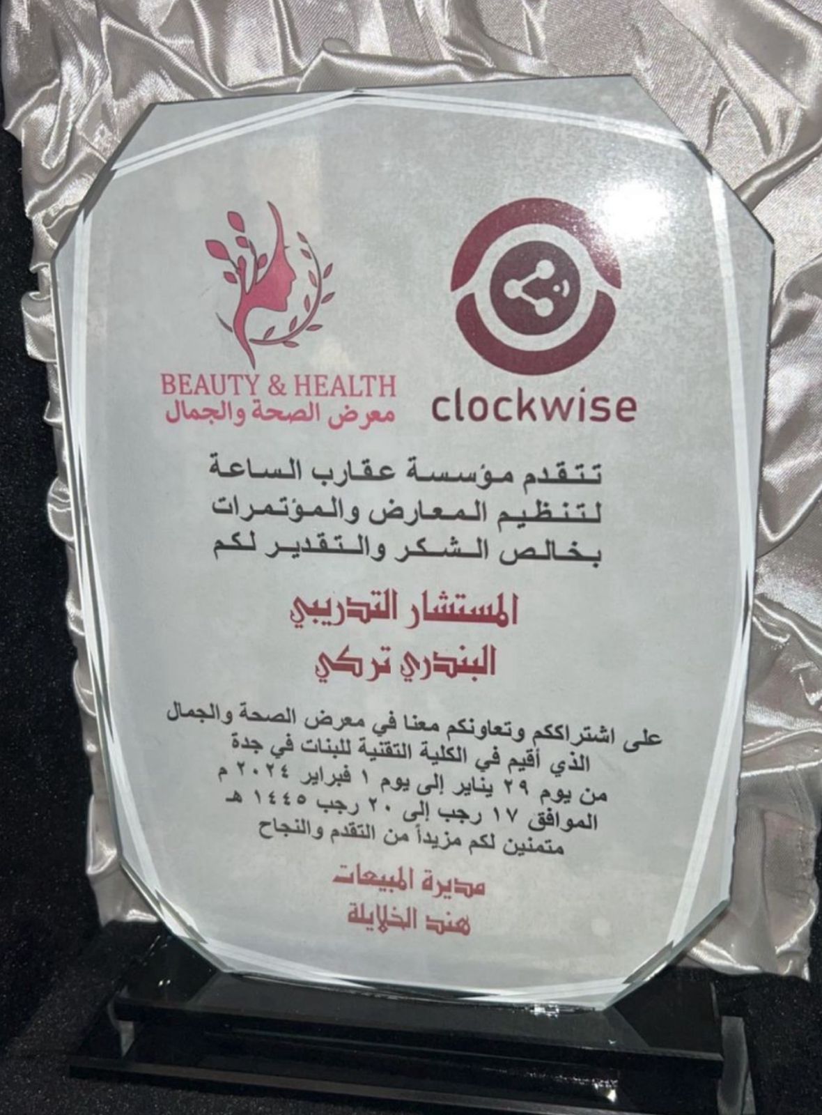 كرمت الكلية التقنية للبنات بجدة المستشار التدرببي البندري تركي عن مشاركتها الفعالة بتقديم برنامج( فن التجميل ) لمنسوبات الكلية في معرض الصحة والجمال من تاريخ 29 يناير إلى 1 فبراير2024م