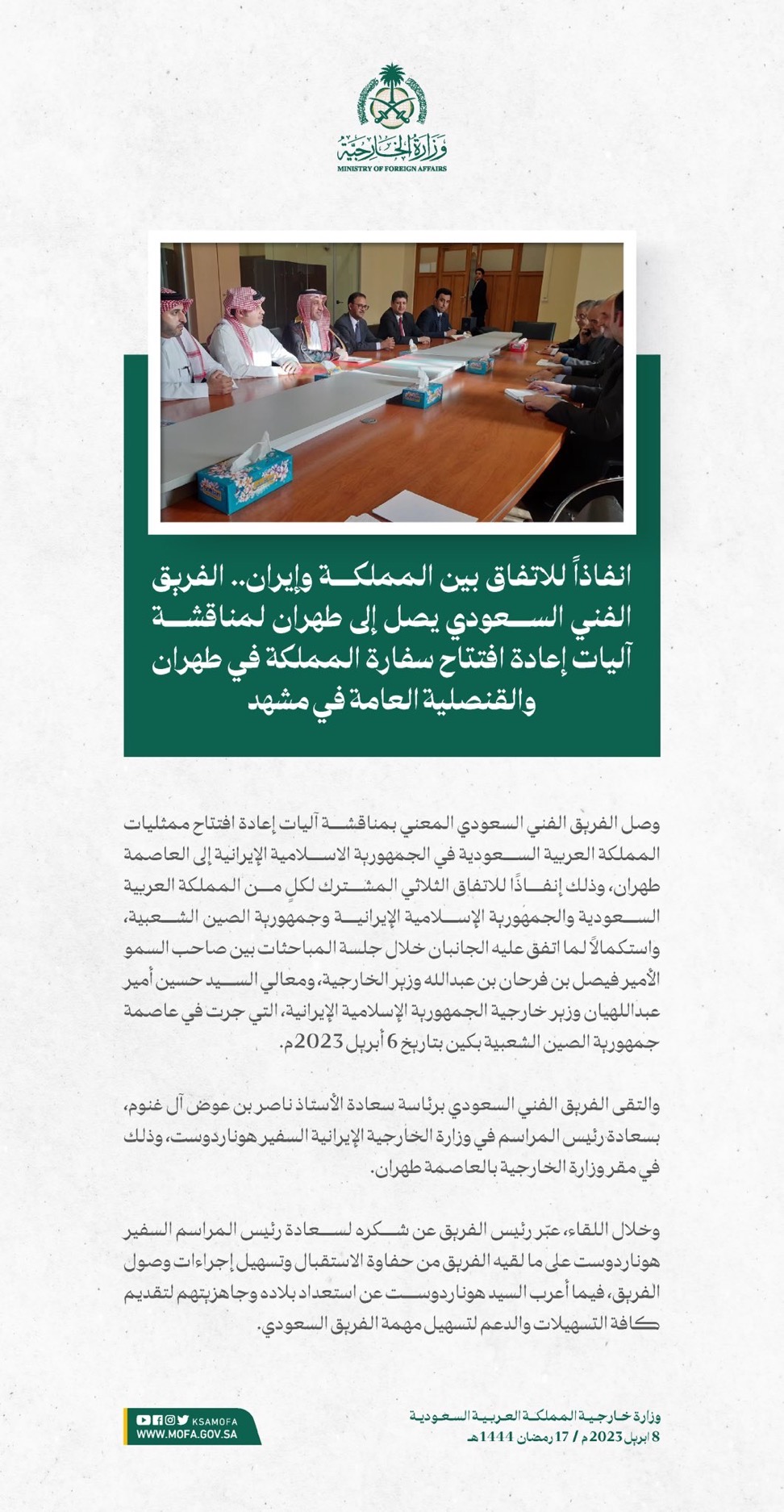 وصل الفريق الفني السعودي المعني بمناقشة آليات إعادة افتتاح ممثليات المملكة العربية السعودية في الجمهورية الاسلامية الإيرانية إلى العاصمة طهران، وذلك إنفاذًا للاتفاق الثلاثي المشترك لكلٍ من المملكة العربية السعودية والجمهورية الإسلامية الإيرانية وجمهورية الصين الشعبية، واستكمالاً لما اتفق عليه الجانبان خلال جلسة المباحثات بين صاحب السمو الأمير فيصل بن فرحان بن عبدالله وزير الخارجية، ومعالي وزير خارجية الجمهورية الإسلامية الإيرانية حسين أمير عبداللهيان، التي جرت في عاصمة جمهورية الصين الشعبية بكين بتاريخ 6 أبريل 2023م.