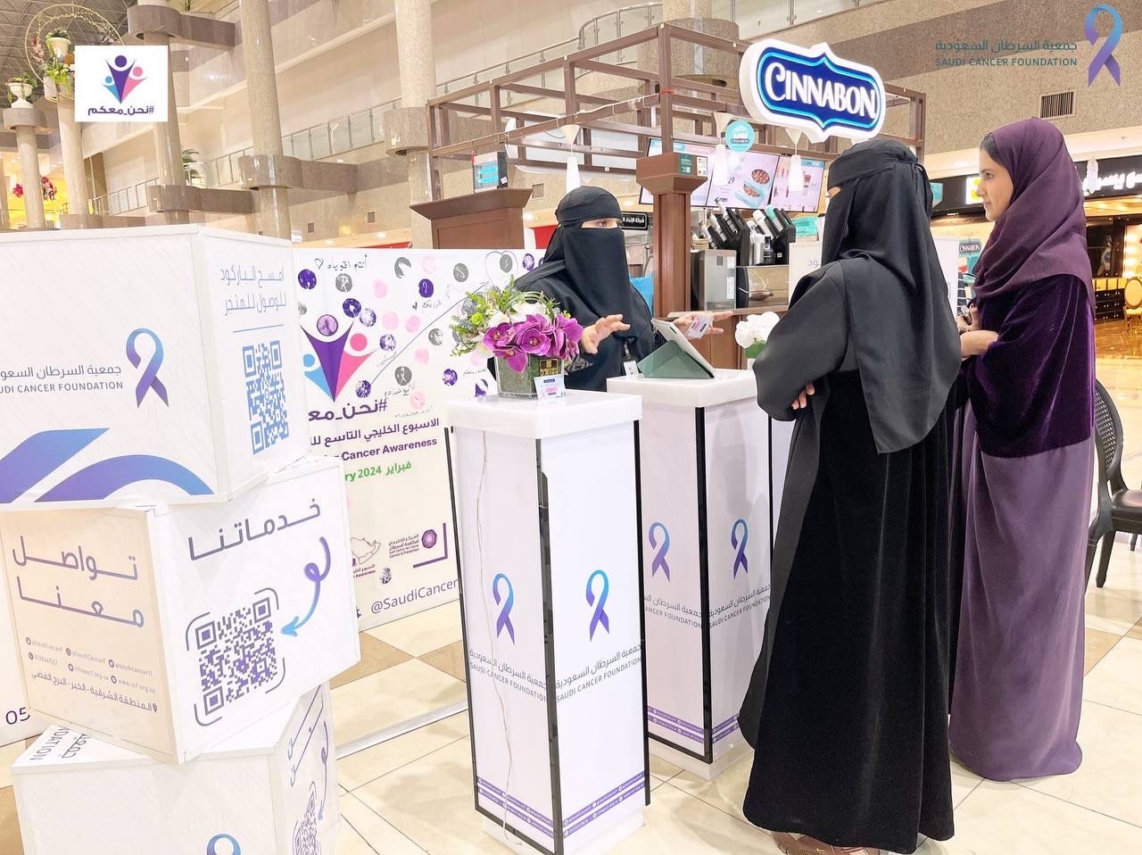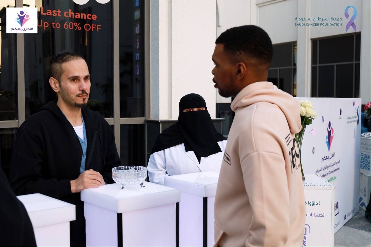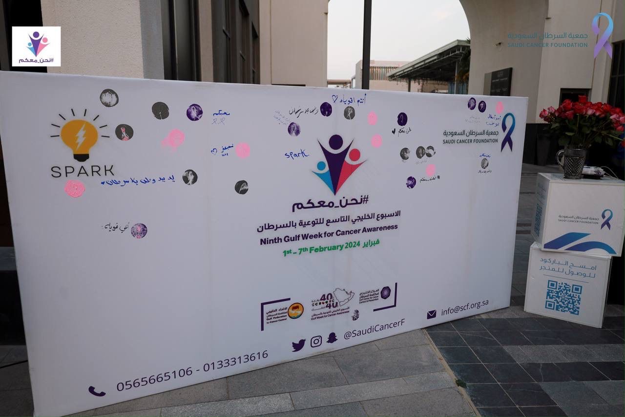 نفذت جمعية السرطان السعودية بالمنطقة الشرقية حملات وأنشطة تثقيفية عديدة تزامنا مع حملة الأسبوع الخليجي التاسع للتوعية بالسرطان خلال شهر فبراير 2024 تحت شعار“ نحن معكم ”للتضامن مع مرضى السرطان وذويهم والتكاتف مع الاتحاد الخليجي لمكافحة السرطان بهدف بزيادة الوعي بمرض السرطان على نطاق أوسع من خلال البرامج والمبادرات الميدانية في المحالّ التجارية والأماكن العامة التي تحظى بتجمع أهالي المنطقة بشكل أوسع وأقامت الجمعية حملة تثقيفية للتوعية بأهمية الفحص المبكر في مرحلة العلاج وتعريف السرطان وكيفية الوقاية منه وسط الحضور ومشاركتهم بالرسم وكتابة العبارات التحفيزية على اللوحة الكبيرة لوضع البصمة التي تحمل صورة الاتحاد تحت شعار (نحن معكم)