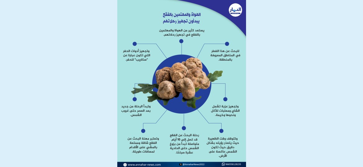 ويستعد كثير من الهواة والمهتمين بالفقع في تجهيز رحلاتهم للبحث عن هذا الفطر في المناطق المعروفة بالمنطقة وتجهيز أدوات الحفر التي تكون عبارة عن "سكاريب " للحفر وتكون بدقة عالية وتجهيز عزبة تشمل الشاي ومعلبات للأكل ونحوها, إضافة إلى خيمة حيث يقضي في صحاريها تصل إلى 10 أيام متواصلة تبدأ من بزوغ الشمس حتى الحادية عشرة صباحًا وتتوقف وقت الظهيرة حيث يتعذر رؤيته بشكل دقيق حيث تكون الشمس عاكسة على الأرض وتبدأ الرحلة من جديد بعد العصر حتى غروب الشمس والتي تعتبر مهنة شاقة وممتعة حيث تكون عملية البحث مشياً على الأقدام بمسافات طويلة بوجود التشققات على سطح الأرض والتي تدل عليه وتسمى " الفقاعة " .