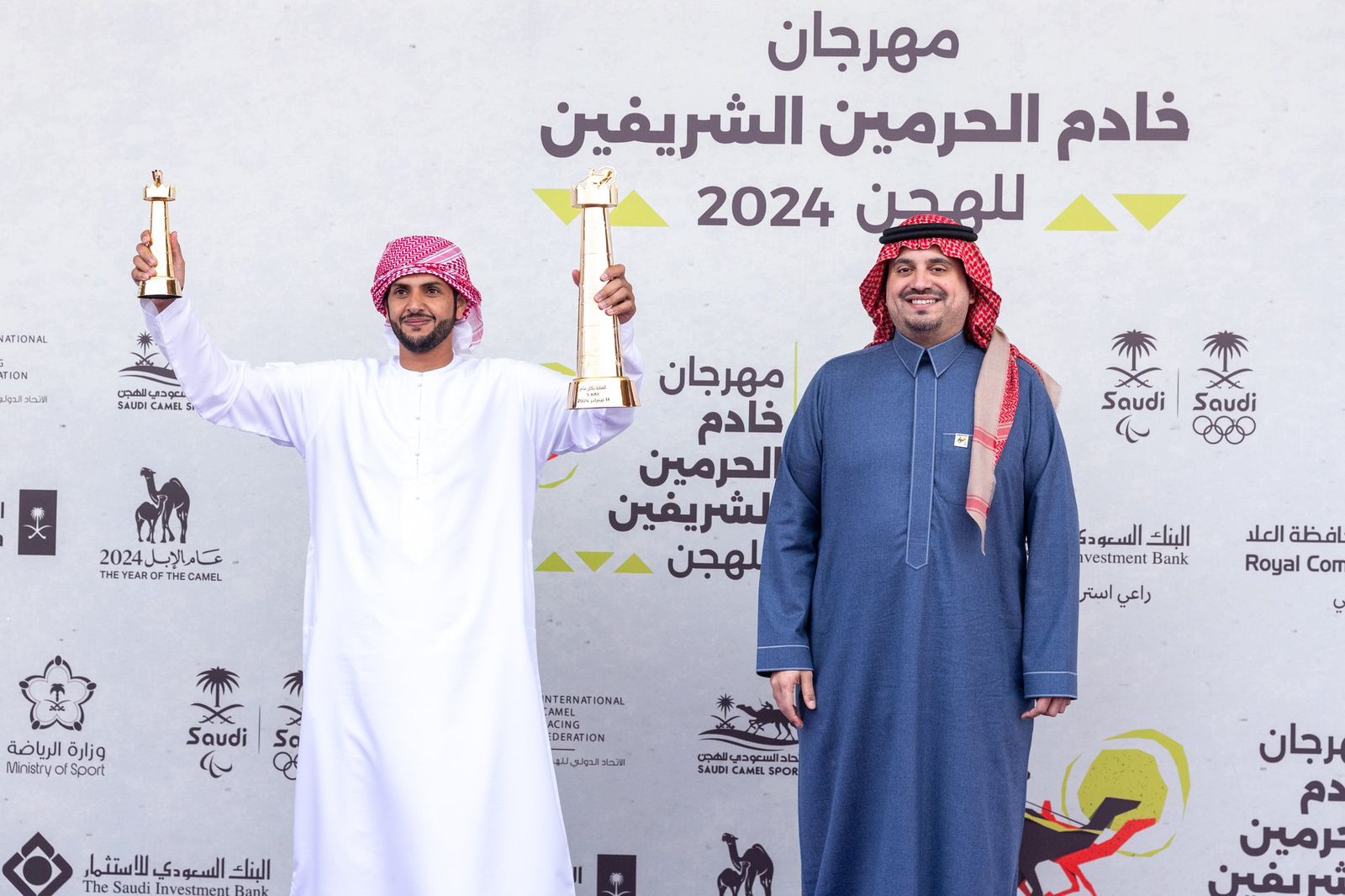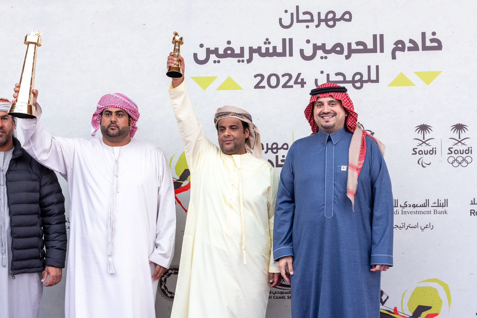 توج صاحب السمو الأمير فهد بن جلوي بن عبد العزيز بن مساعد رئيس مجلس إدارة الاتحاد السعودي للهجن اليوم الأحد، ملاك الهجن من الإمارات الفائزين بألقاب أشواط رموز مهرجان خادم الحرمين الشريفين للهجن في فئة الـ "لقايا"، والذي انطلقت نسخته الأولى الخميس الماضي وينظمها الاتحاد السعودي للهجن حتى الـ 18 من شهر فبراير الجاري، على أرض ميدان الجنادرية في مدينة الرياض.