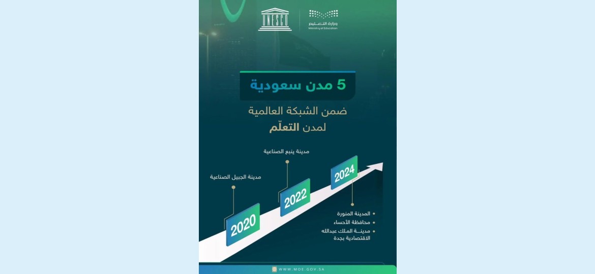 وبذلك زاد عدد مدن المملكة ضمن الشبكة العالمية إلى خمس مدن تعلّم، بما يسهم في إعداد وتأهيل مواطن منافس عالمياً، وفق مستهدفات التنمية المستدامة ورؤية المملكة 2030.
