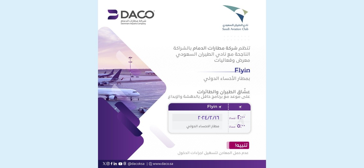 ينطلق اليوم الجمعة ١٦ فبراير ٢٠٢٤م معرض وفعالية "فلاي-إن" التي تنظمها شركة مطارات الدمام بالشراكة الناجحة مع نادي الطيران السعودي، وتنطلق الفعالية عند الثانية ظهرا بمطار الأحساء الدولي.