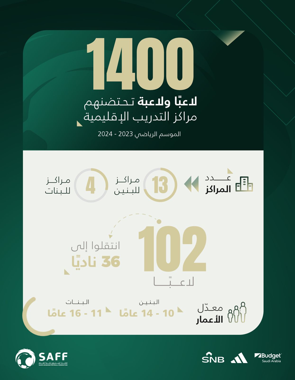 يواصل أكثر من 1400 لاعب ولاعبة تمارينهم اليومية في مراكز التدريب الإقليمية البالغ عددها 17 مركزًا منها 4 مراكز للبنات، وتتوزع هذه المراكز في الرياض "4 مراكز"، والدمام "مركزين" وجدة "مركزين" والأحساء، وتبوك، وحائل، والقصيم، وجازان، ومكة المكرمة، والطائف، ونجران، والمدينة المنورة، تحت إشراف أجهزة وطنية من مدربين ومدربات معتمدين بالإضافة لأجهزة إدارية وطبية.
