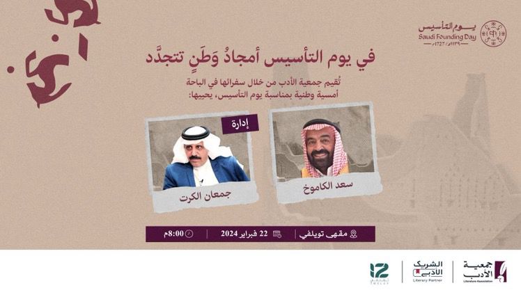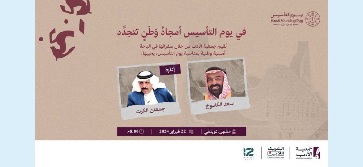 بمناسبة يوم التأسيس لوطننا الغالي الذي يصادف 22 فبراير ينظم سفراء جمعية الأدب بمنطقة الباحة أمسية ثقافية يشارك الأديب والمؤرخ الأستاذ سعد الكاموخ بطرح ورقة تحت عنوان (يوم التأسيس مسيرة خير وعطاء وبناء ونماء موفقة) . بمقهى "تويلفي" الشريك الأدبي بمنطقة الباحة