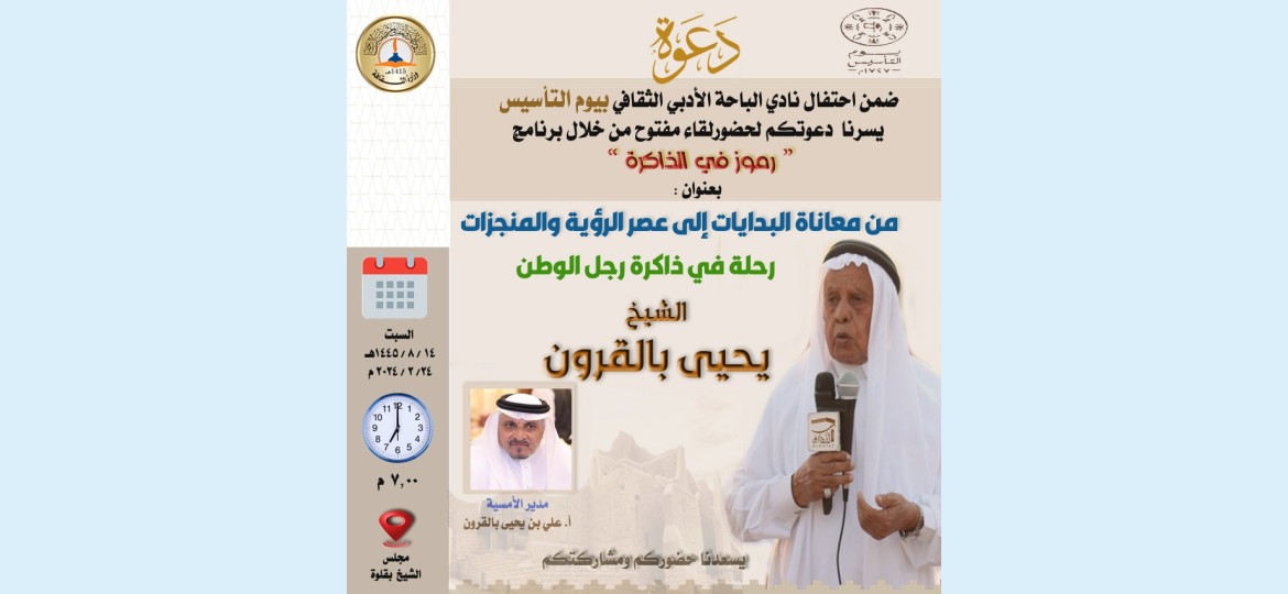 يواصل نادي الباحة الأدبي الثقافي بمنطقة الباحة، حضوره في إثراء المشهد الثقافي، بالتزامن مع مناسبة يوم التأسيس، وضمن فعاليات شتاء الباحة، حيث يحط رحاله في محافظة قلوة مستأنفاً مبادرته التي اطلقها منذ عدة أعوام، تحت عنوان "رموز في الذاكرة" بلقاء الشيخ يحيى بالقرون في أمسية "من معاناة البدايات إلى عصر الرؤية والمنجزات".