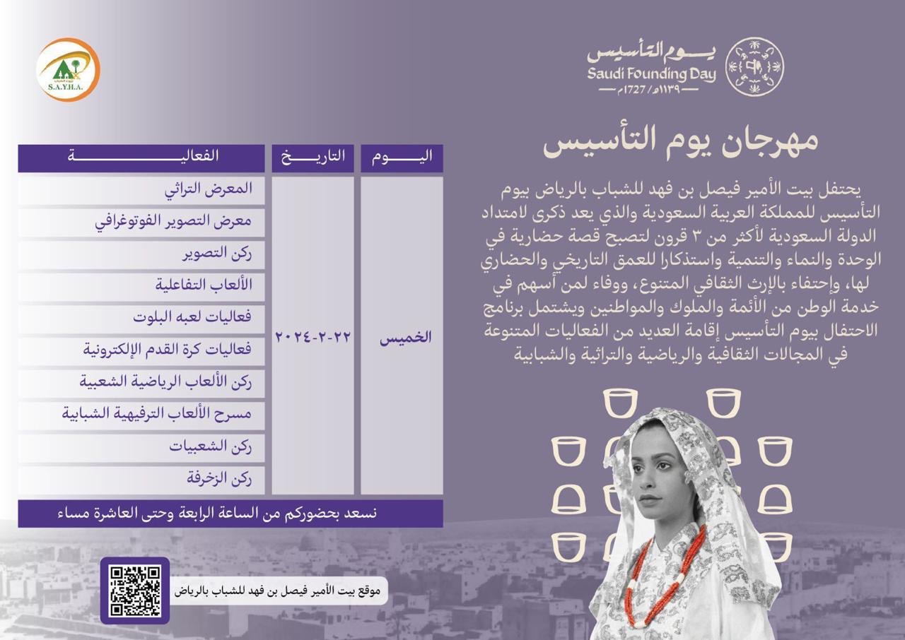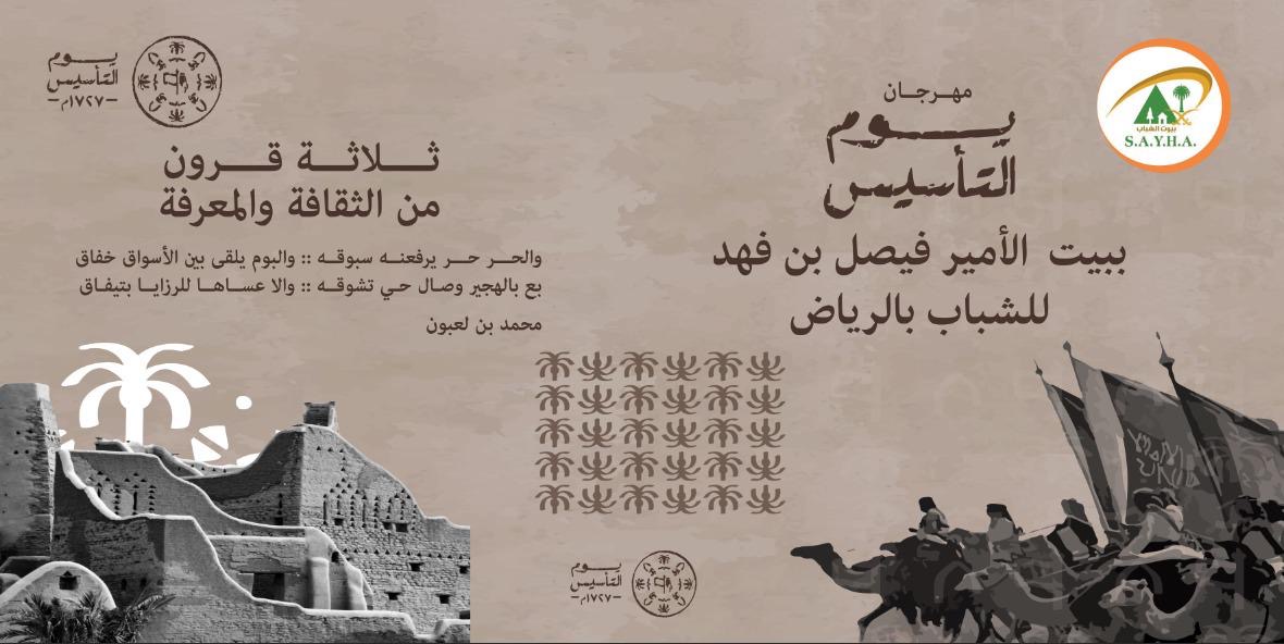 تنطلق فعاليات يوم التأسيس في بيت الأمير فيصل بن فهد للشباب بمدينة الرياض يوم الخميس المقبل الساعة الرابعة عصراً، بمشاركة عدد من أعضاء بيت الشباب والجهات المشاركة والزوار.