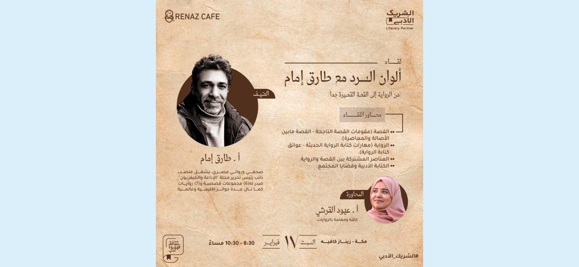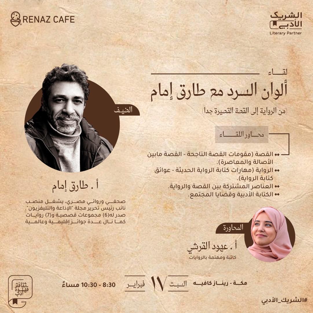 كان مرتادي مقهى ريناز بالعوالي بمكه بأمسياته الثقافية ومن محبي الأدب وفنونه وخصوصاً الرواية من يوم السبت السابع عشر من شهر فبراير على موعد مع الروائي المصري طارق امام والقادم من أرض الكنانة والتي إنطلقت منها النهضة العربية وحركة التنوير ليست في مصر فقط بل إمتدت لبلاد العرب قاطبة بدءا من القرن التاسع عشر للميلاد بروادها الأوائل فاناخت رحال هذا الروائي الجميل بمكه المكرمة أرض النور ومهد الرسالة ومهد لغة العرب هذه اللغة التي شكلت ملامح هويتنا الثقافية نحن العرب وفي المقابل كانت تحاوره شخصية غير عادية وهي ليست إعلامية ولكنها أديبة مثله تصيغ لغتها الجميلة كما يصيغ الصائغ حٌلي الذهب ولا أعتقد هناك أفضل من يتحاور مع صناع الرواية بمثل براعة وإقتدار الأستاذة عهود القرشي التي تجعلك مندهش من لغتها وفصاحتها ومهارتها وفطنتها وإستنتاجاتها في إدارة اي حوار فهي بالفعل وجه مُشرق للثقافة العربية من جيل الشباب فكانت المٌحاضَرة للروائي طارق إمام عنوانها: "ألوان السرد مع طارق إمام ... من الرواية إلى القصة القصيرة جداً" من خلال المحاور التالية :